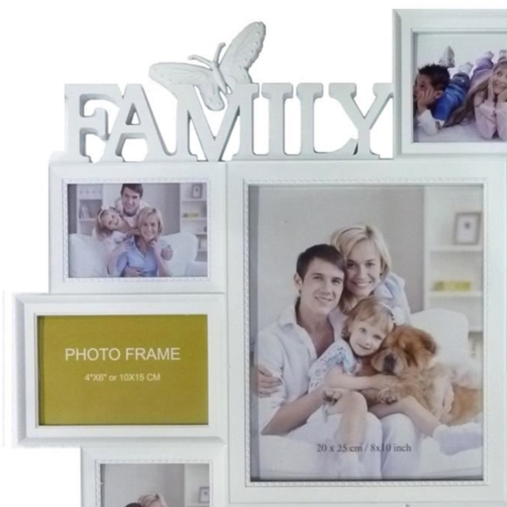 Showcase your cherished memories with the Gr8 Home White Embossed Wall Hanging Family Photo Frame. This large, elegant frame features a beautiful butterfly and leaf design, adding a touch of nature-inspired charm to any room. Made from durable plastic and finished in a classic white colour, it holds up to nine pictures in various sizes; three slots for 10 x 15cm photos, two slots for 12 x 8cm photos, one central slot for a 20 x 25cm) photo, two slots for 15 x 10cm photos, and one slot for a 17 x 12cm photo. Measuring approximately 60cm x 54cm x 1.5cm, this multi-picture holder is perfect for creating a personalised gallery wall that celebrates your family's special moments.