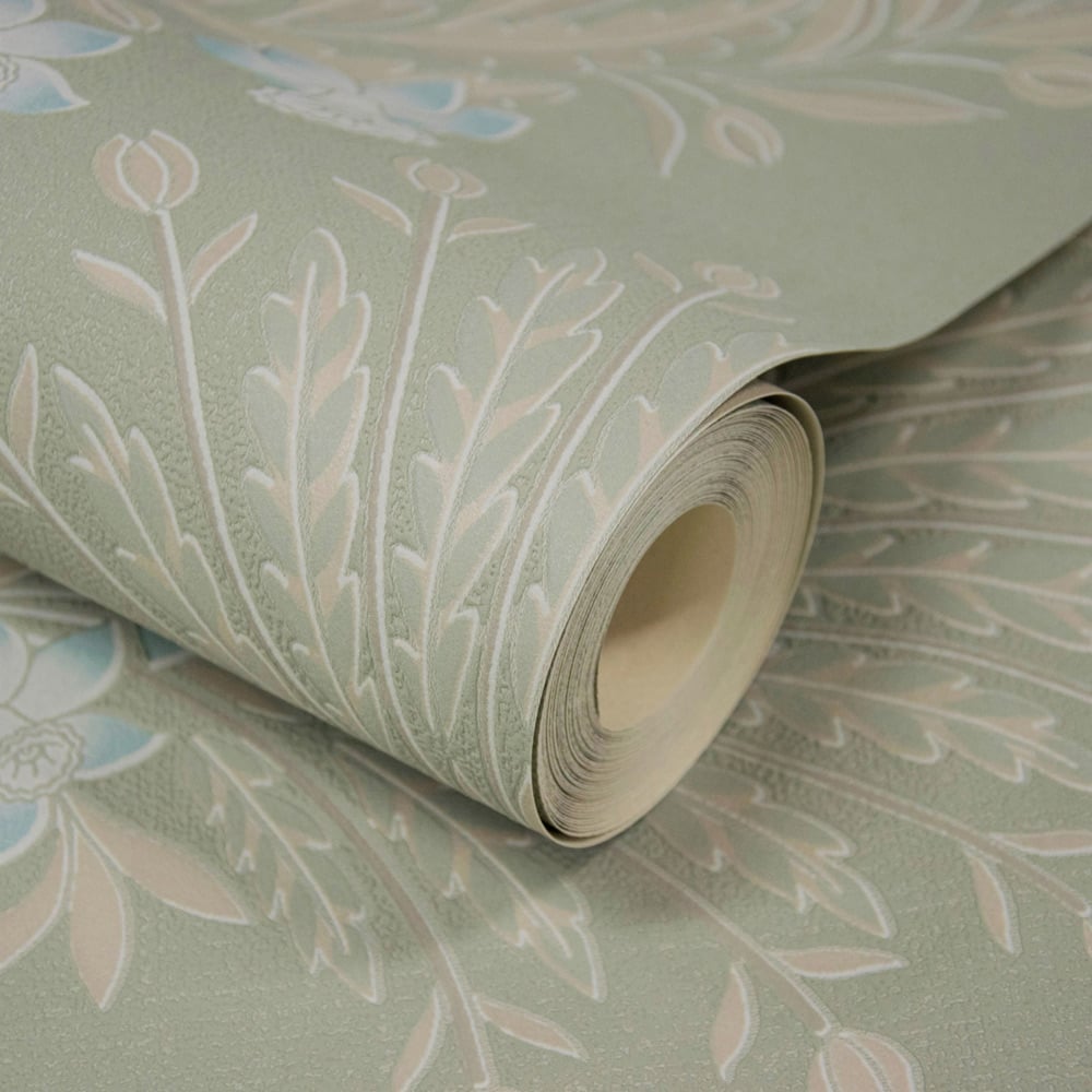 This easy-living Grandeco Flora Damask Wallpaper in sage green is inspired by the historic arts and crafts trend. The spring-like motifs bring a fresh feel to your home. This textured blown vinyl four-wall design is perfect to be used in a lounge, kitchen or dining room and is superb for covering uneven walls. This traditional paste-the-paper wallcovering will also help cover cracks and minor imperfections.