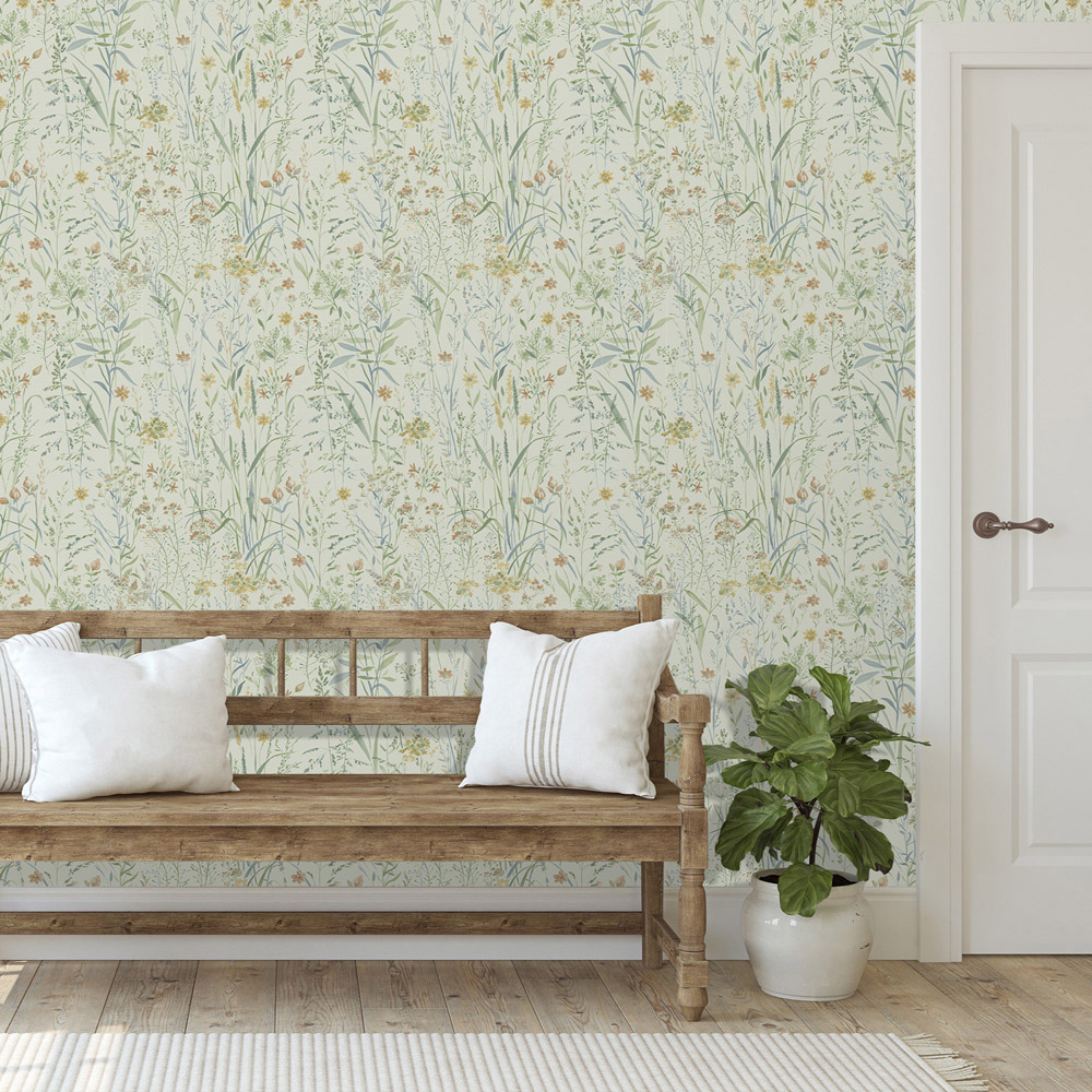 Bring the tranquillity of a wild meadow indoors with floral grass effect wallpaper, featuring delicate flower sprigs and grass leaves, all beautifully rendered in a soft hand-painted watercolour style that creates a calming nature-inspired look for any living room or bedroom; easy to hang with paste the wall application and a textured finish that helps cover minor imperfections, this eco-friendly botanical wallpaper offers a subtle yet striking way to refresh your space.