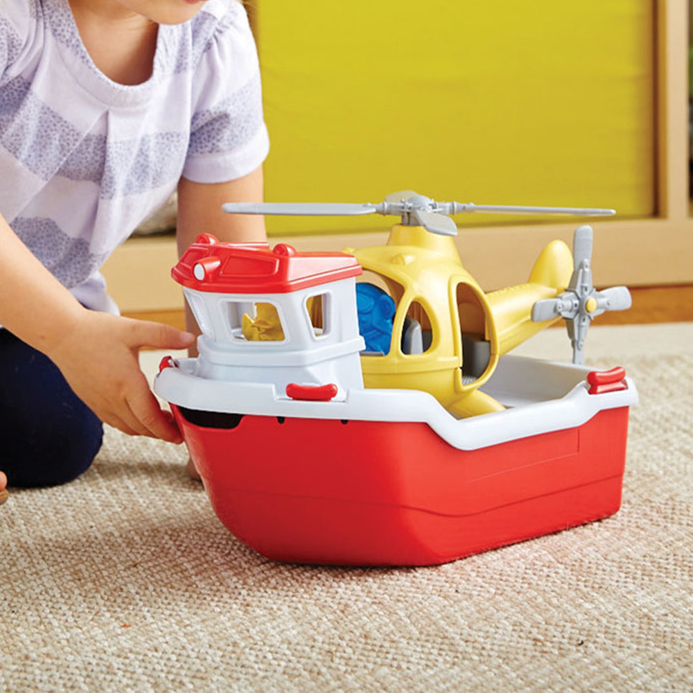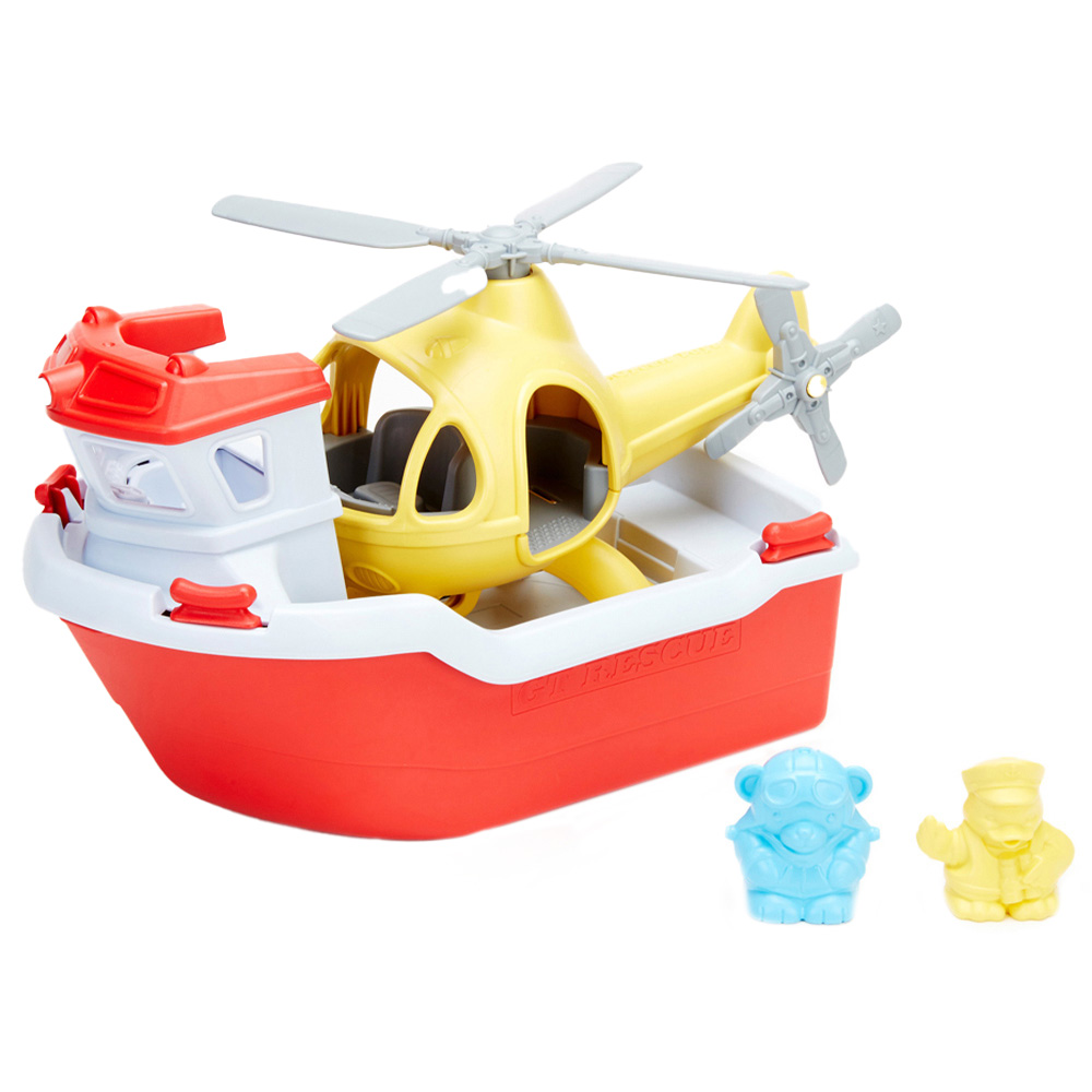 The Green Toys Rescue Boat and Helicopter are ready to save the day at sea! This 2-in-1 water toy is ideal for a bath, pool or garden. Features a single full-size helicopter as well as a rescue boat that floats and has a wide spout to scoop and pour water. The easy-open design also makes cleaning easy! It includes a captain duck and a pilot bear figure made in the USA from 100% recycled milk jugs. Suitable for ages two years and above, this seaplane is safe and non-toxic, containing zero BPA, PVC, phthalates or external coatings.