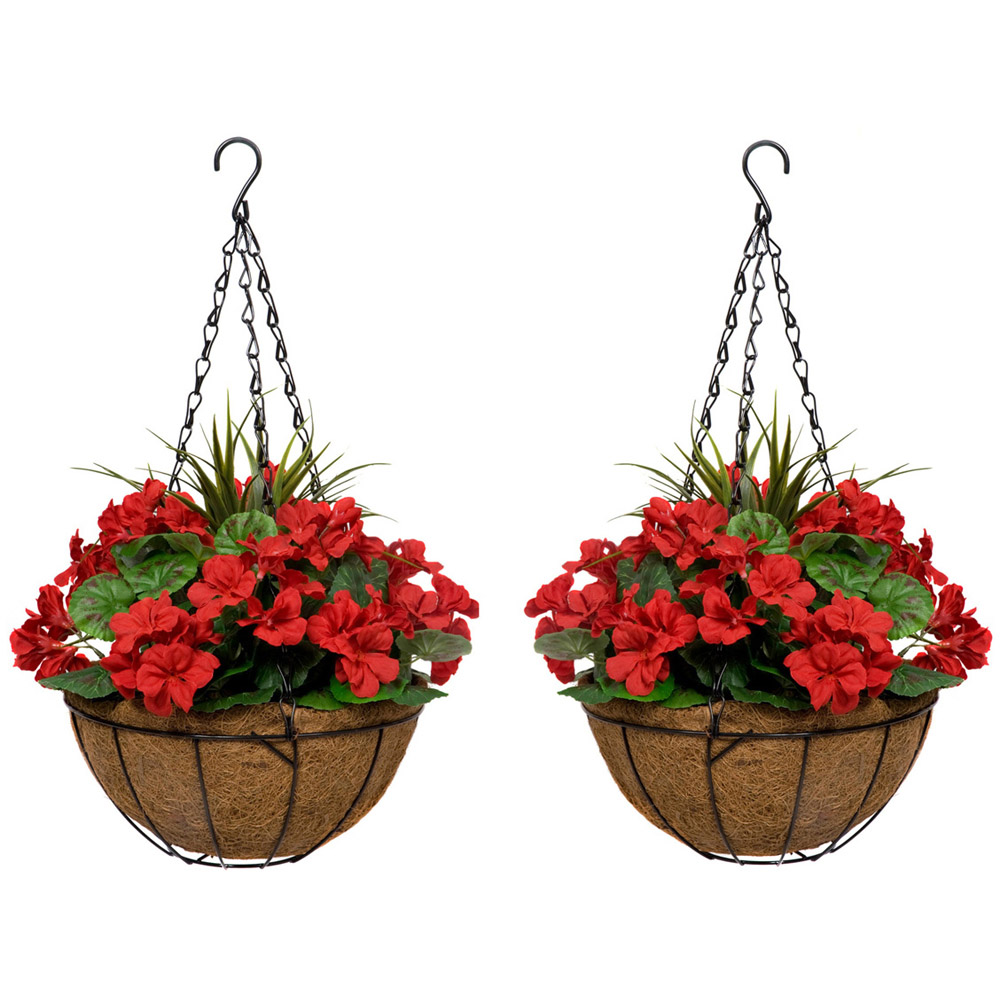 Add vibrant colours and a touch of nature's elegance into your space with the GreenBrokers Artificial Geranium Hanging Plant. This pair of round hanging baskets with bright red geraniums with decorative grass in the centre is perfect to elevate your space. Extremely realistic and lifelike looking, from a short distance it's hard to believe they are not real. Stylish and compact, the plants come in half-ball shape coco coir hanging baskets with silver metal chains and hanging hooks. Easy to use, you do not require any assembly and can hang the baskets straightaway. However, we recommend you spend some time gently arranging the foliage by folding out branches, leaves and flowers to a natural-looking shape. Suitable for both indoor and outdoor use, these plant baskets can stay outside in all weather conditions all year round. Easy to maintain, they make a simple and carefree alternative to real hanging baskets and require no care or special attention. Also, they limit the hassle of time-consuming watering, feeding or pruning, simply unpack, hang, sit back and enjoy. Pack of 2. Size: H52 x W34cm.