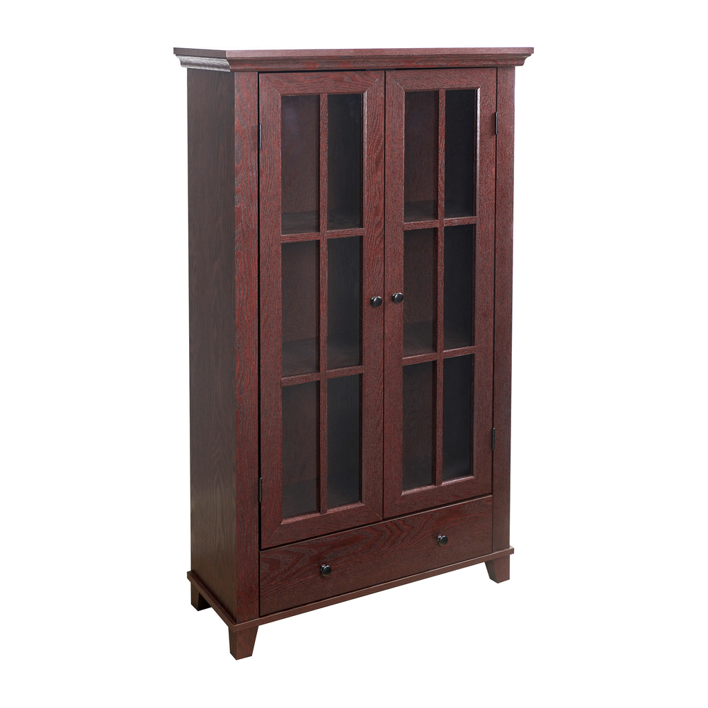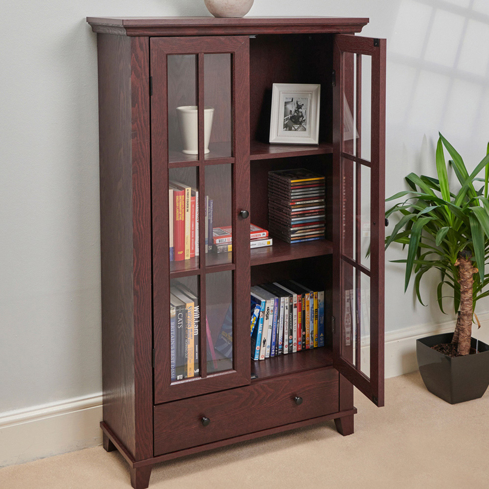 Keep your space organised with the Greenhurst 2 Door Single Drawer Mahogany Storage Cabinet. This stylish and elegant display cabinet is perfect for storing your treasured collections of DVDs, CDs, books, or ornaments. The double doors of the cabinet close securely with magnetic fasteners to keep your items safe and organised. The spacious interior offers two shelves that can be adjusted to fit your needs, while the handy drawer at the base of the cabinet provides additional storage space. The cabinet is crafted from high-quality particle board and MDF with perspex doors and a realistic mahogany colour finish to give a luxurious look to your space. Order now and elevate the style and functionality of your space with our stunning display cabinet. Assembly is easy and hassle-free, and the overall size of the cabinet is H132.5 x W76 x D30cm, with shelves measuring W66.5 x D24.5cm and a drawer inner storage area of H9 x W55 x D23.5cm.