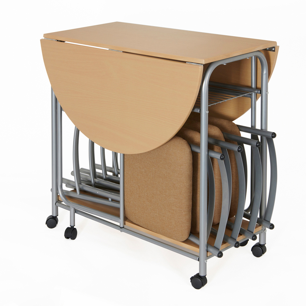 Redefine your dining space with the Greenhurst 4-Seater Stowaway Dining Set Oak and Silver. With its unique design, the two tabletop end panels drop down, and the four chairs fold and stack neatly under the table, allowing for a space-saving footprint of just 45 x 84cm when not in use. Plus, it comes with castors for easy movement, two of which lock for added stability when in use. It is not only lightweight yet strong but also easy to move around, making it perfect for hosting guests at any time. The table also features a useful shelf for storage, ensuring that all your dining essentials are within reach. Manufactured from sturdy powder-coated steel with a laminated MDF tabletop, this dining set is built to last. The four chairs come with contrasting coloured fabric-covered pads and can hold a user weight of up to 110kg. Plus, it's easy to assemble at home. Table Size: Open: H80 x L115 x D84cm. Closed: H80 x L45 x D84cm. Chair Size: Seat Pad: H82 x L35 x D37cm (seat height 48cm).