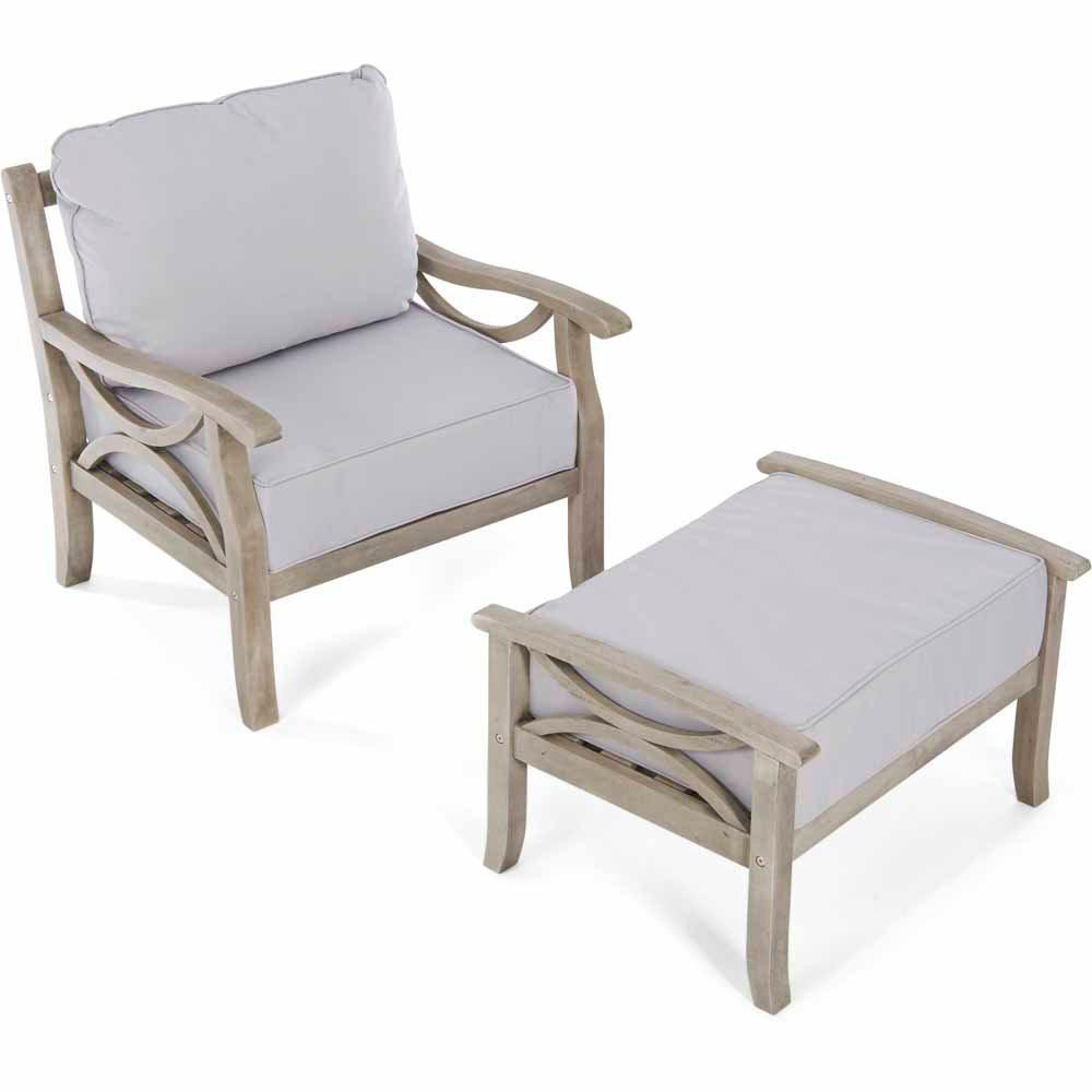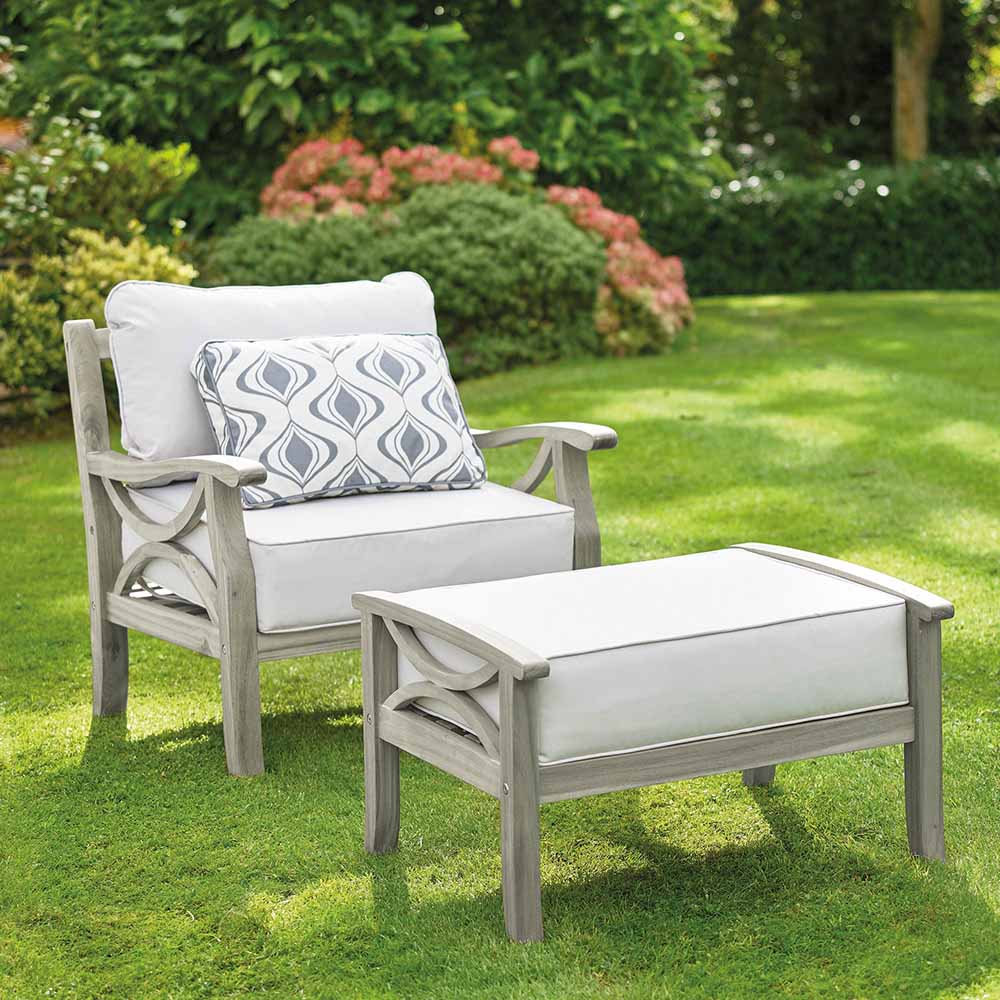 The Sorrento armchair and matching stool beautifully crafted from managed and sustainable acacia hardwood timbers is an elegant set ideal for outdoor lounging or relaxing in a conservatory. The heavy-duty polyester cushions are shower resistant and have a generous 15cm filling designed for comfort. The furniture in a light grey finish is easy to clean and maintain. The set requires minimal assembly and needs little maintenance to prolong the natural beauty of the wood. A simple clean with soapy water will keep this lovely set in peak condition for years to come. The chair size is 72cm high x 70cm x 72cm, the cushion seat size is 15cm high x 60 x 54cm. The stool size is 41cm high x 68cm x 54cm and the stool cushion size is 15cm high x 60cm x 48cm. Protect your garden furniture with our durable and waterproof covers. Explore our wide range of heavy-duty Garden Furniture covers to find the perfect fit for your needs.