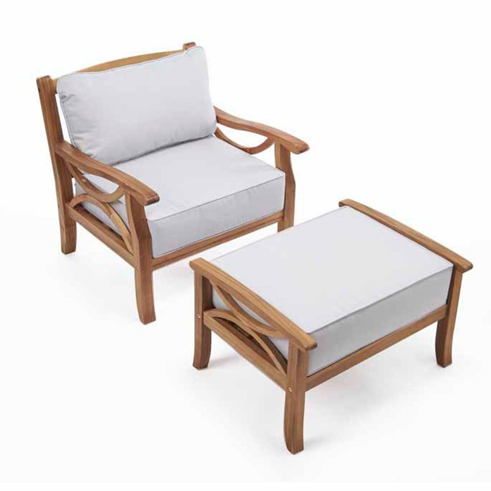 The Sorrento armchair and matching stool beautifully crafted from managed and sustainable acacia hardwood timbers is an elegant set ideal for outdoor lounging or relaxing in a conservatory. The heavy-duty polyester cushions are shower resistant and have a generous 15cm filling designed for comfort. The furniture in natural finish is easy to clean and maintain. The set requires minimal assembly and needs little maintenance to prolong the natural beauty of the wood. A simple clean with soapy water will keep this lovely set in peak condition for years to come. The chair size is 72cm high x 70cm x 72cm, the cushion seat size is 15cm high x 60 x 54cm. The stool size is 41cm high x 68cm x 54cm and the stool cushion size is 15cm high x 60cm x 48cm. Protect your garden furniture with our durable and waterproof covers. Explore our wide range of heavy-duty Garden Furniture covers to find the perfect fit for your needs.