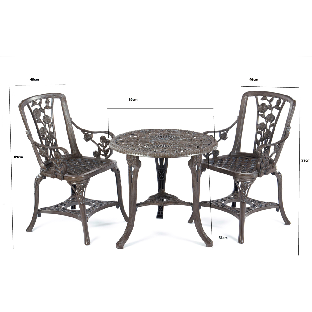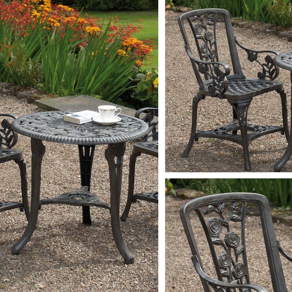 Classic Rose Armchair Patio Set makes an ideal choice for sitting in the garden. Classic Rose Bistro Set with two comfy armchairs makes an ideal choice for those who enjoy sitting in the garden. Designed in a vintage style this set is light weight and easier to move than its cast iron predecessor. Manufactured from UV-stabilised polyurethane it is not only strong, but also resistant to all types of weather. Manufactured to British Standard. Table: H66x 69cm diam. Chair: H89 x W46 x D43cm Protect your garden furniture with our durable and waterproof covers. Explore our wide range of heavy-duty Garden Furniture covers to find the perfect fit for your needs.