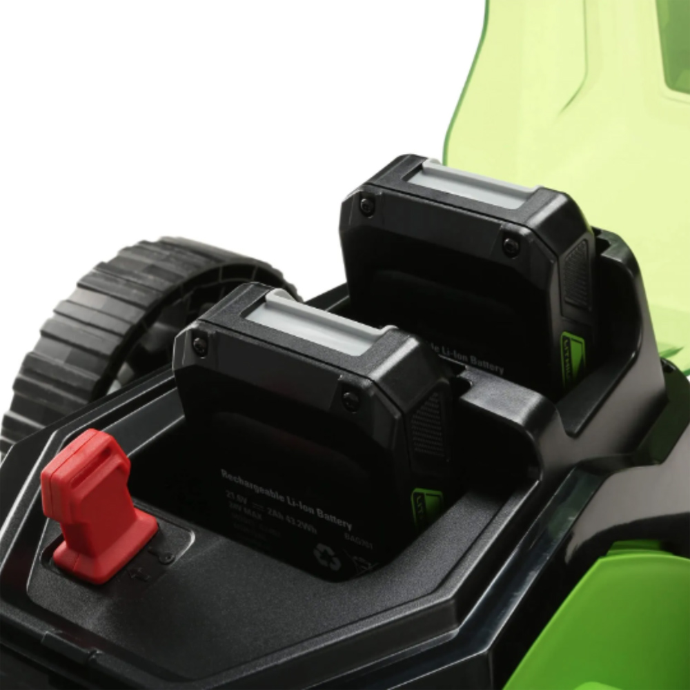 Maintain your lawn with the Greenworks 41cm Cordless Lawn Mower. This 48V lawn mower is ideal for cutting medium-sized lawns in less time. This lawnmower is powered using two interchangeable high-performance 24V lithium-ion batteries. It also features a two-in-one function of mulching and side discharge or rear collection. In line with the wide 46cm cutting path, this lawnmower features a large capacity 55L collection bag, four cutting actions, and six easily selectable cutting heights (25-80mm) for pristine lawn care. This lawn comes with a three year warranty. 2 x 4AH battery and 2A twin charger included.