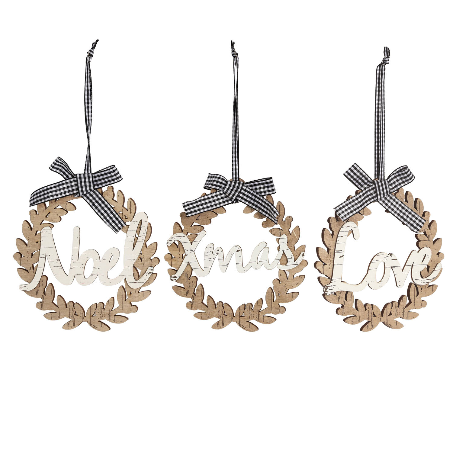 Add some subtle festive cheer to your home with this Grey Gingham Wooden Christmas Wreath. Coming in an assortment of designs, one reading 'Love', one reading 'Noel' and the other reading 'Xmas', all with a stylish gingham bow that allows you to hang this wreath with ease.