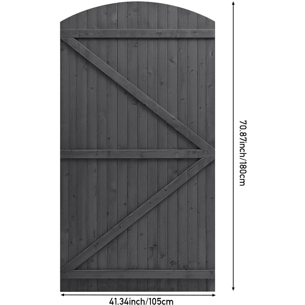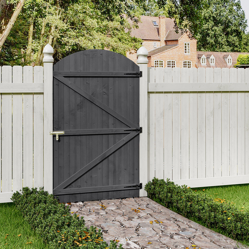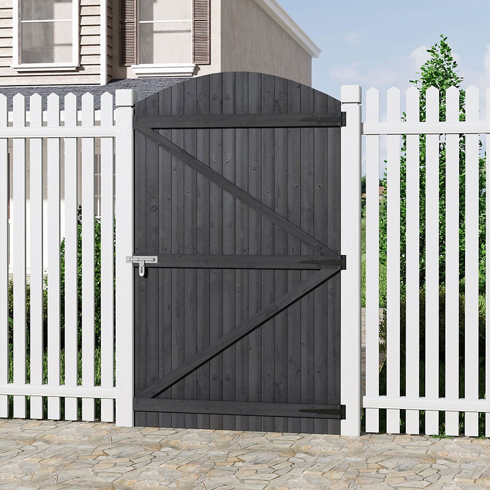 Enhance the charm and security of your outdoor space with this elegantly designed wooden garden gate. Featuring a gracefully arched top, this gate adds a refined touch to your garden, patio, or entrance while serving as a sturdy and reliable barrier. Whether you're looking to keep pets and children safe or define the boundaries of your property, this gate offers both style and functionality. Crafted from high-quality pine wood, it is built to withstand the elements, resisting warping, moisture damage, and fading from sunlight. The smooth-planed surface enhances its aesthetic appeal while providing a polished finish that reduces the risk of splinters and ensures a comfortable touch. With multiple size options available, you can find the perfect fit for your outdoor space. Plus, installation is hassle-free with included hardware and easy-to-follow instructions(three 8-inch T-hinges, one deadbolt, self-tapping screws), allowing you to set it up quickly and enjoy both privacy and style in your garden.