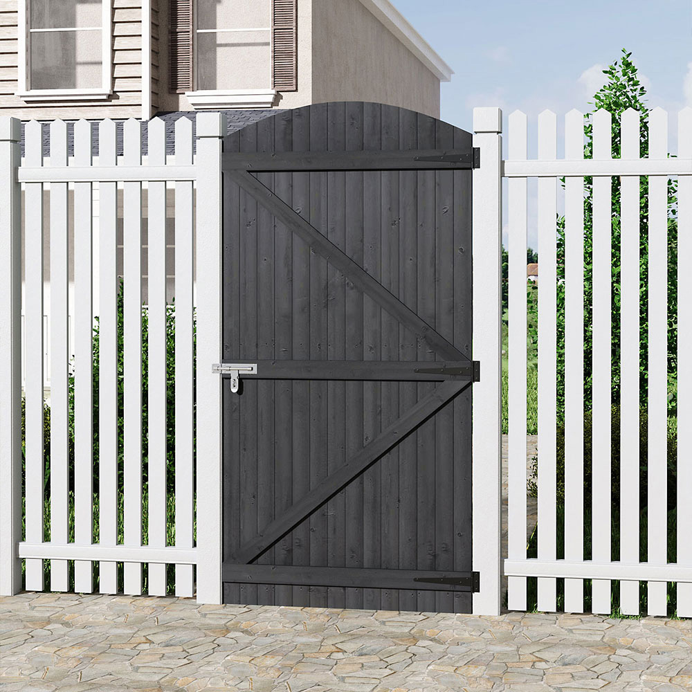 Enhance the charm and security of your outdoor space with this elegantly designed wooden garden gate. Featuring a gracefully arched top, this gate adds a refined touch to your garden, patio, or entrance while serving as a sturdy and reliable barrier. Whether you're looking to keep pets and children safe or define the boundaries of your property, this gate offers both style and functionality. Crafted from high-quality pine wood, it is built to withstand the elements, resisting warping, moisture damage, and fading from sunlight. The smooth-planed surface enhances its aesthetic appeal while providing a polished finish that reduces the risk of splinters and ensures a comfortable touch. With multiple size options available, you can find the perfect fit for your outdoor space. Plus, installation is hassle-free with included hardware and easy-to-follow instructions(three 8-inch T-hinges, one deadbolt, self-tapping screws), allowing you to set it up quickly and enjoy both privacy and style in your garden.