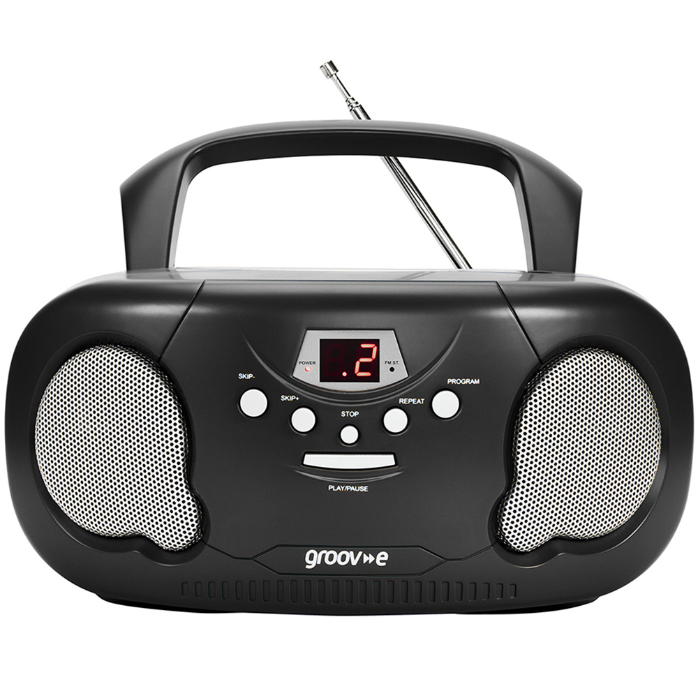 Bring the party anywhere with the Groov-e Black Boombox. This device combines a CD Player with a radio in a portable package. Connect your MP3 player, smartphone or tablet to listen to your music, and simply plug in your headphones for private listening. The sleek and stylish design is compact to travel with, and it supports multiple formats such as CD, CD-R and CD/RW. It features an LED display that informs about the channel you are tuning into or which CD track is currently on.