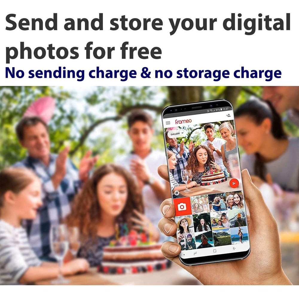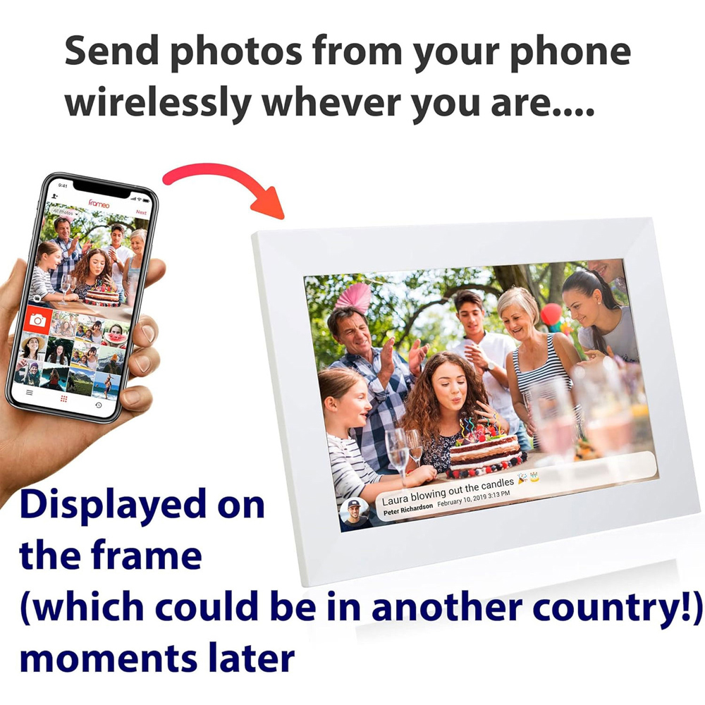 Send your special moments to the special people in your life. Quick & easy to send photos. Include a short message with your photo, or not. Send from your smart phone or tablet straight to the digital photo frame. Plug the photo frame in to mains power (mains powered only), connect to your WiFi using the easy wizard and you are ready. Just ask your family & friends to download the Frameo app, give them your photo frames ID number and they can immediately start sending you photos. Set your frame to play your photos in random mode. Choose whether your photo frame plays audio with video clips or not.