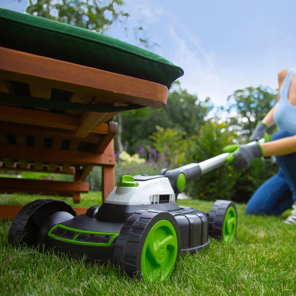 The perfect partner to your GT50, the SLM50 is the lightest lawnmower yet, weighing just 2.5kg on its own or 3.5kg when fully assembled. Manoeuvre with ease while the SLM50 does the hard work. At just 3.5kg fully assembled, you can comfortably push the mini lawnmower throughout your garden using just one hand. It's the perfect solution for cutting narrow areas and smaller spaces typically unsuited to larger models. The small lawnmower's height is kept to a minimum so you can slide it beneath your trampolines, tables, and other garden features. And with its low-profile reclining handle, you can reach even further underneath without needing to move. Lose the hassle of adjusting your furniture and find more time to enjoy your garden. Please Note: This product does not include a pole and battery.