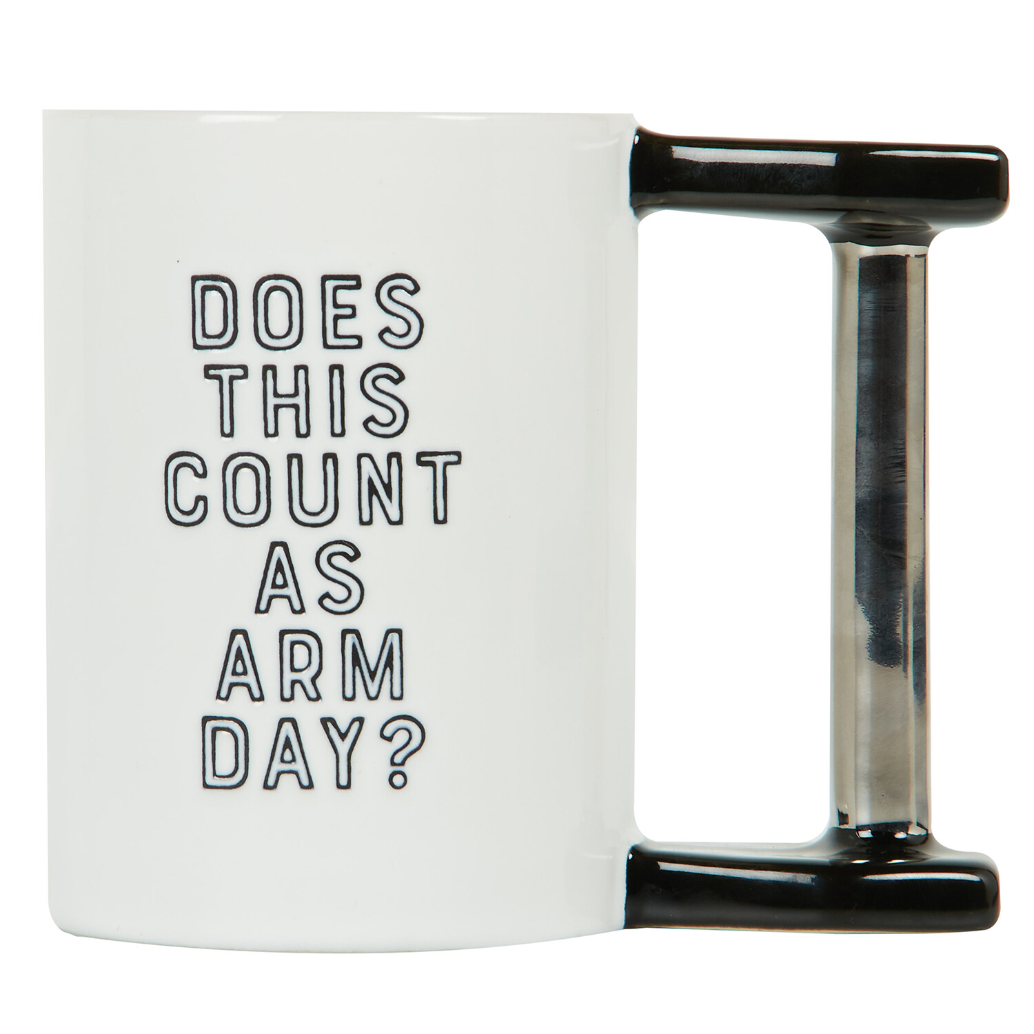 Jumpstart your mornings with some fresh coffee in the Gym Mug. This mug features a humorous 'Does This Count as Arm Day?' slogan and a dumbbell-shaped handle that gives it a fun look, making it perfect for any fitness enthusiast.