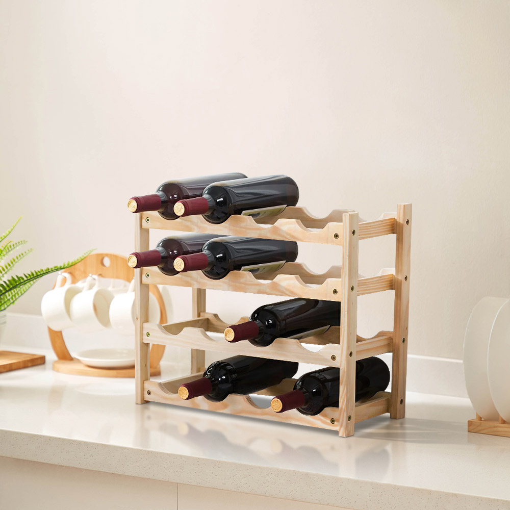 Store your wine collection in style using this wooden wine rack. Expertly crafted, it features a smooth, polished surface and a beautiful natural wood texture. With space for up to 16 bottles of red wine across four layers, the secure leaning design ensures stability. Its compact, sturdy build and simple, clean aesthetics make it a perfect addition to any space. Organise your wine elegantly and enjoy easy access to your favourite bottles whenever you like.