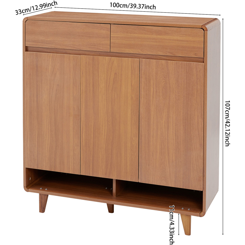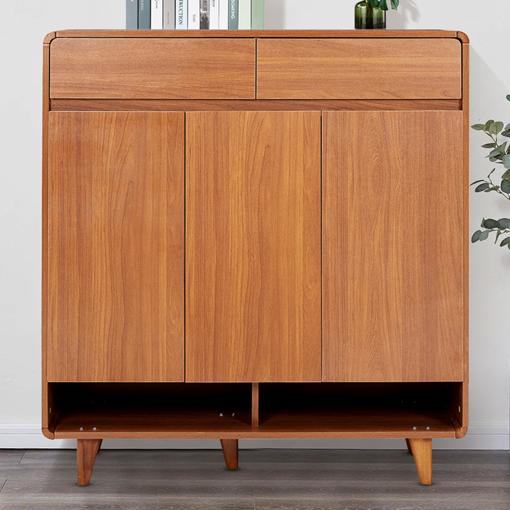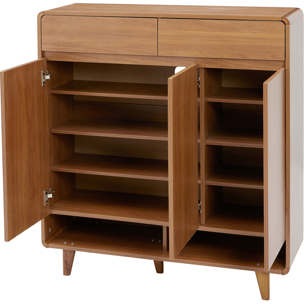 Let your guests be impressed the moment they enter with this charming shoe cabinet. Its warm brown hue, natural wood texture, and smooth surface add a rustic, soft touch to any space. Equipped with two small drawers, four interior shelves, and an open shelf at the bottom, it keeps your entrance tidy and organised while making a welcoming first impression.