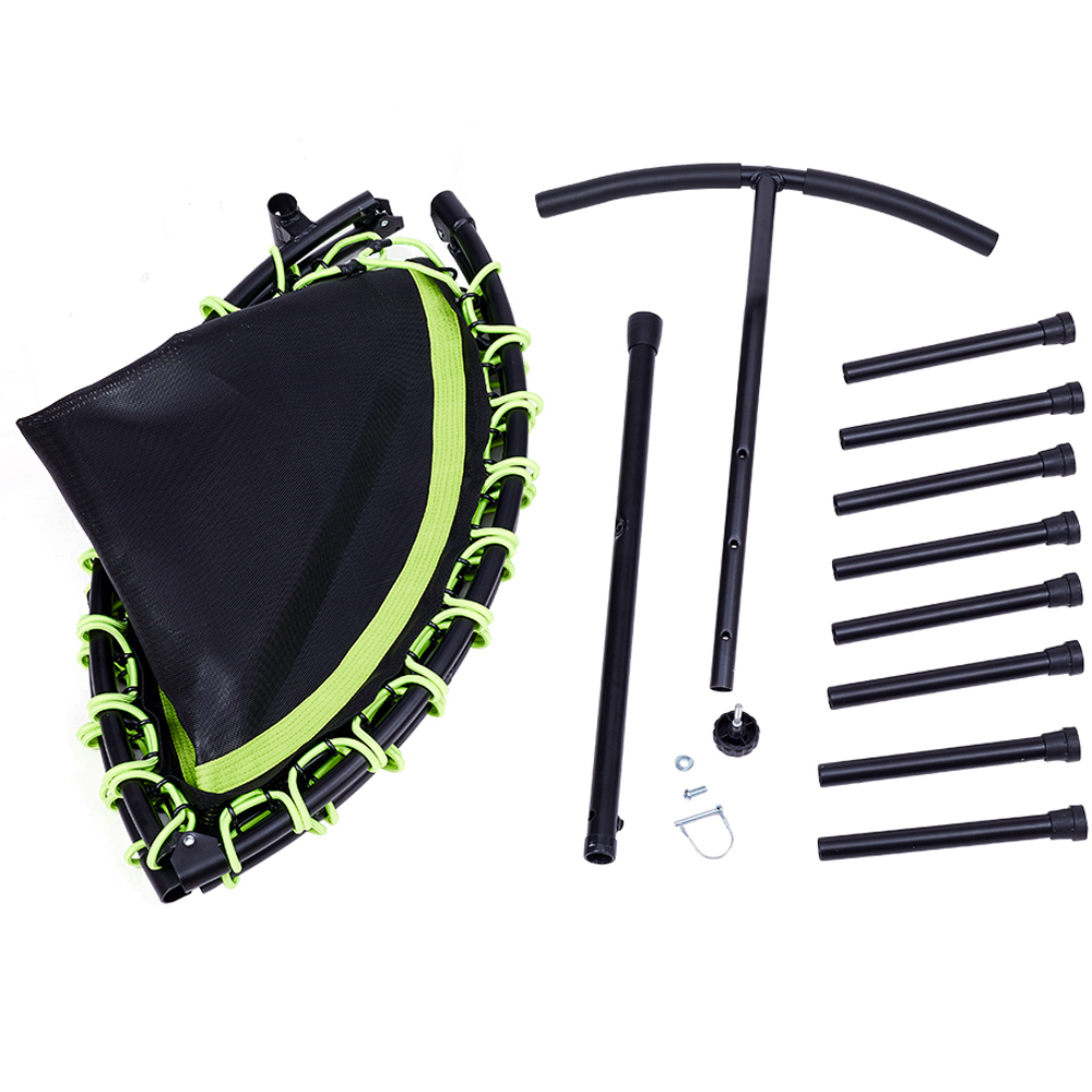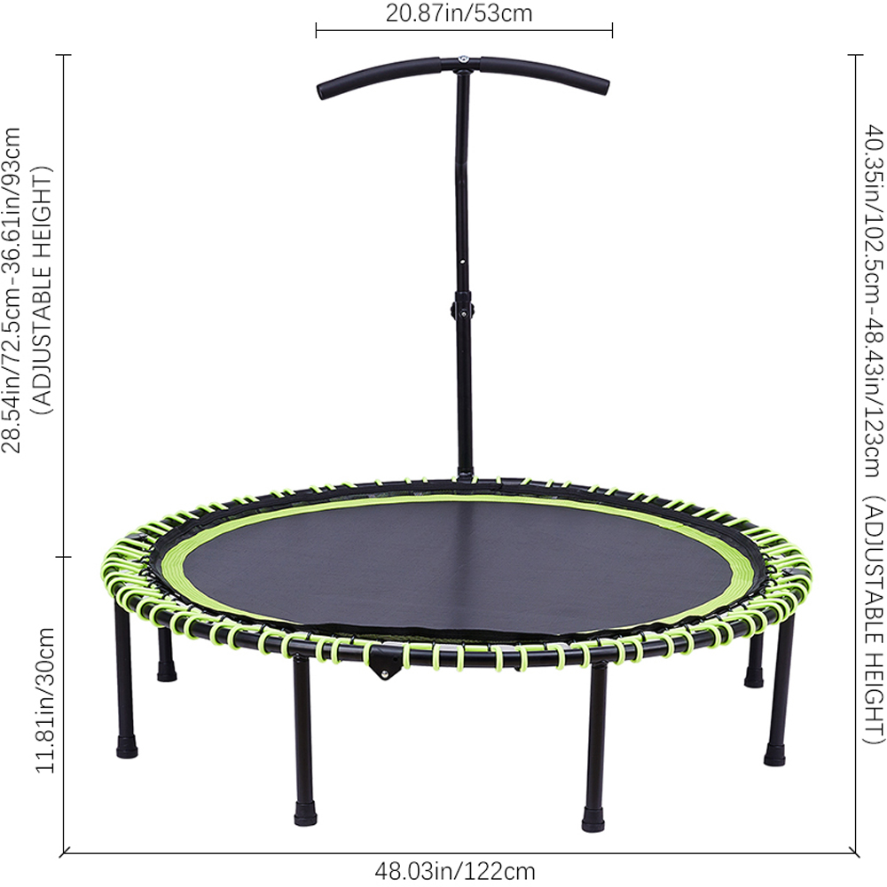 Kickstart a full-body workout at home with our fitness trampoline. Featuring a round shape, it provides generous jumping space, making your workouts effective by engaging muscles across your entire body. Designed to protect your joints, it reduces impact while you exercise. The adjustable U-shaped handle offers extra support and balance, with different height settings to fit everyone in the family.