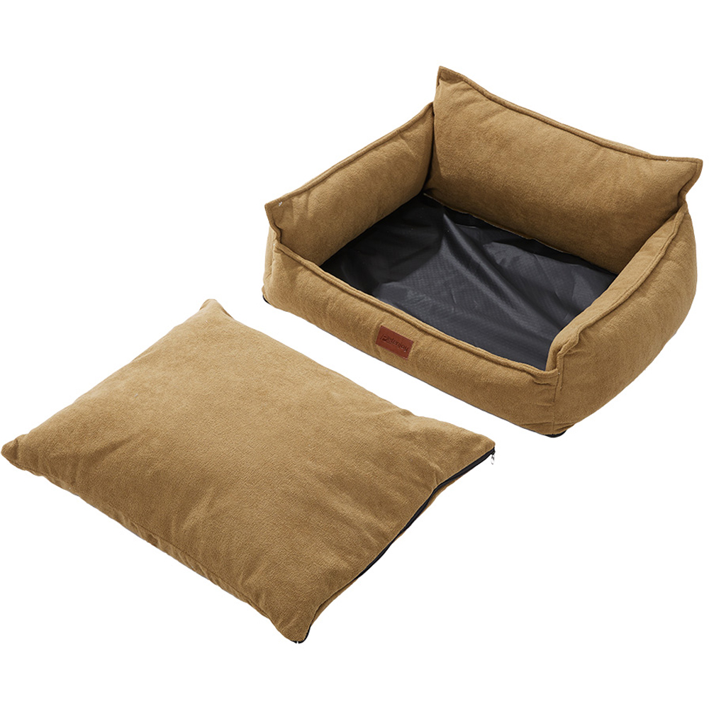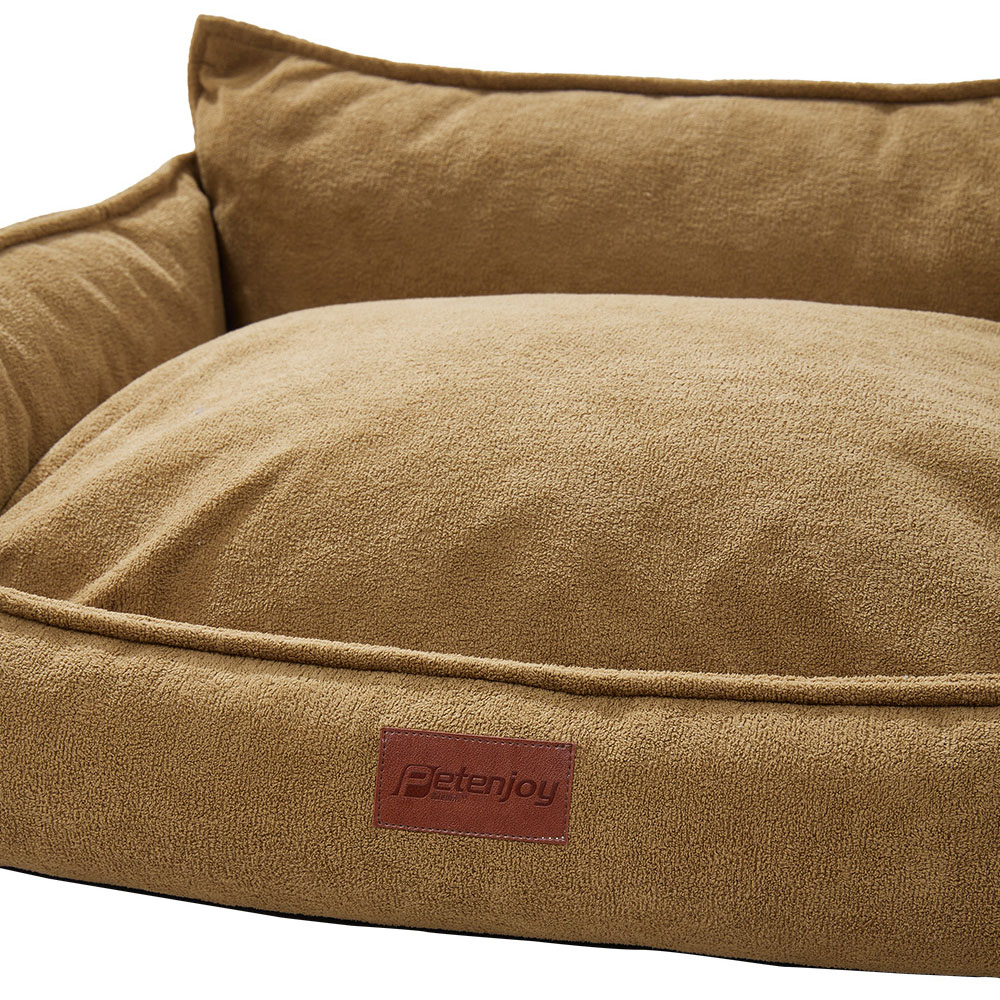 The pet sofa bed is crafted from ultra-soft short plush, providing a breathable and comfy spot perfect for all seasons. Padded with dense foam, it offers just the right amount of comfort. The cushion cover is equipped with a smooth zipper to make cleaning a breeze. This bed isn’t just a resting spot; it’s a peaceful haven that pets will love to curl up in. The non-slip bottom prevents unwanted sliding, while the supportive bolster offers additional support. Its modern appearance features a brown tone.