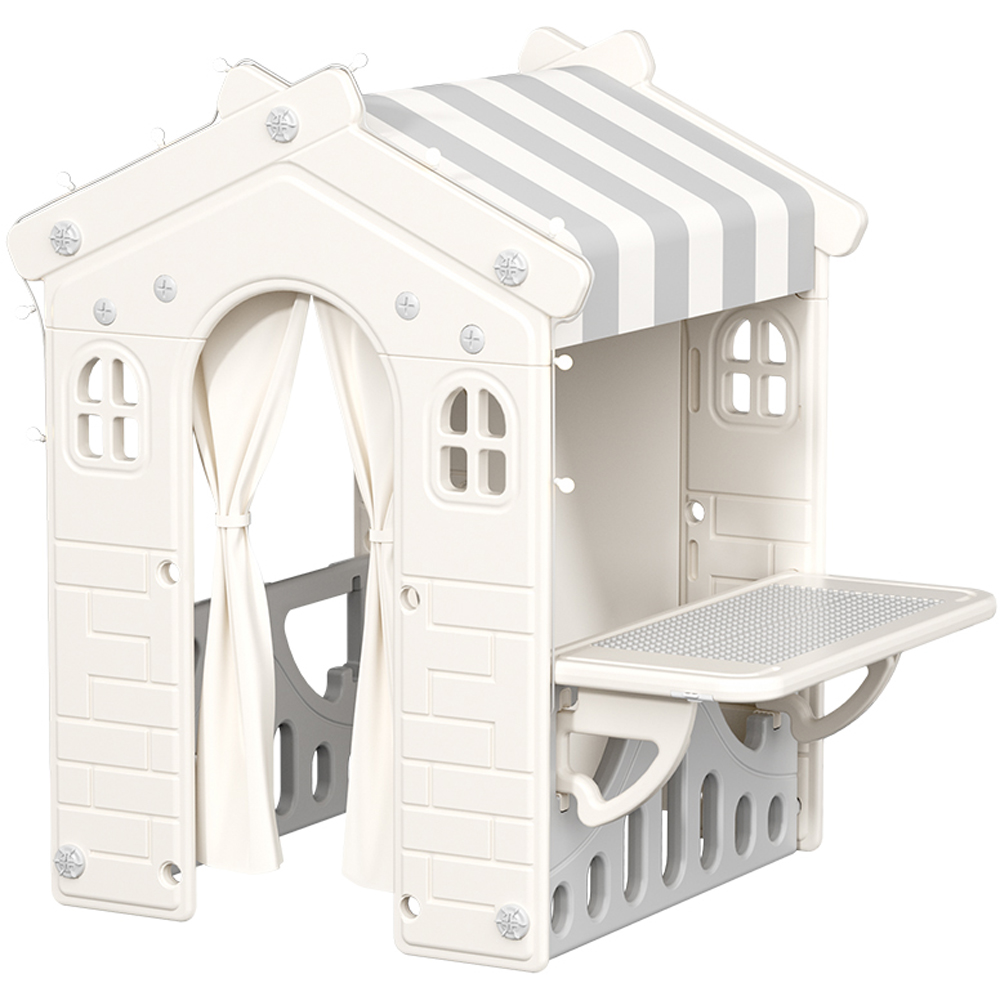 This children's playhouse lets kids dive into imaginative role play. Made from durable HDPE and PP materials, the whimsical hideaway features four windows and two arched entryways with curtains, providing a private space for little ones. A rectangular building block table extends outward, while striped fabric on the roof gives the playhouse the feel of a cosy open-air café. Ideal for playdates and creative adventures, this tent house inspires fun and imagination in any environment!