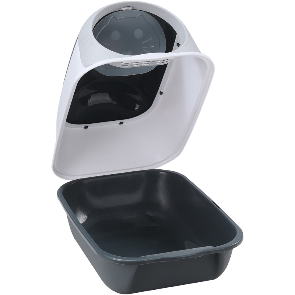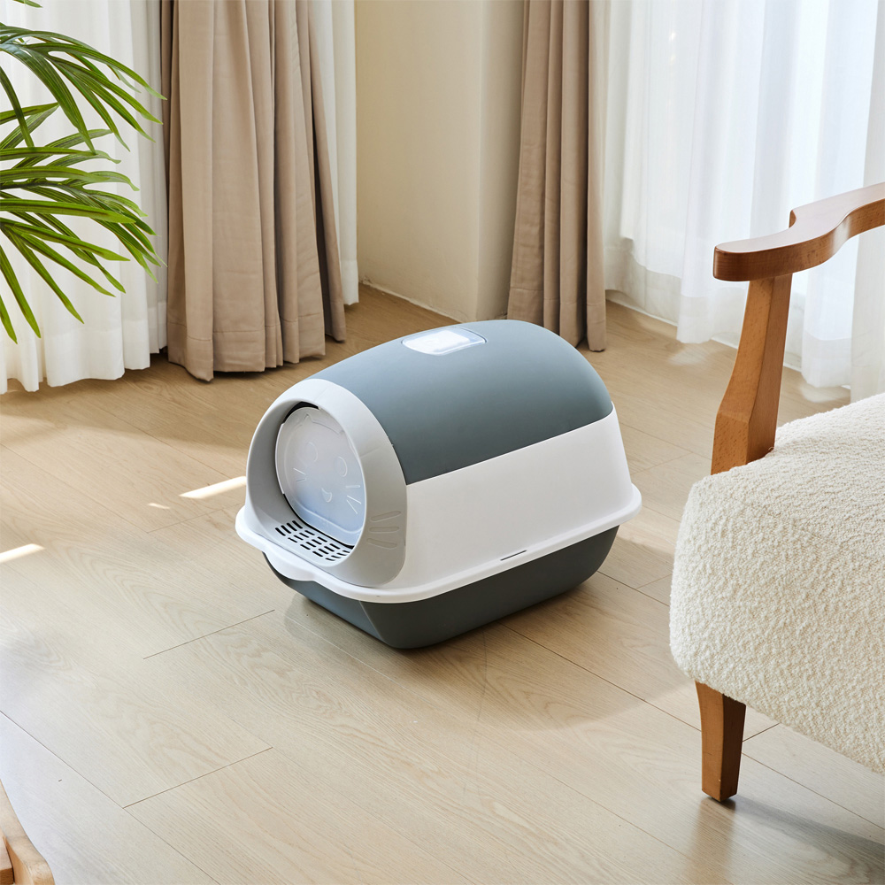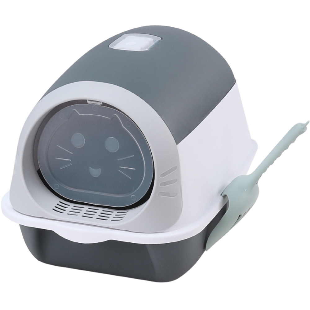 This cat litter box combines sleek design with playful charm, standing out with a rounded door with a smiley cat. Its spacious interior comfortably accommodates cats of all sizes and ensures easy access. The fully enclosed structure offers privacy and controls odour. A front pedal helps minimise litter tracking, keeping your floor clean. Plus, the top deodoriser box keeps the air fresh, providing a hygienic for your cat.