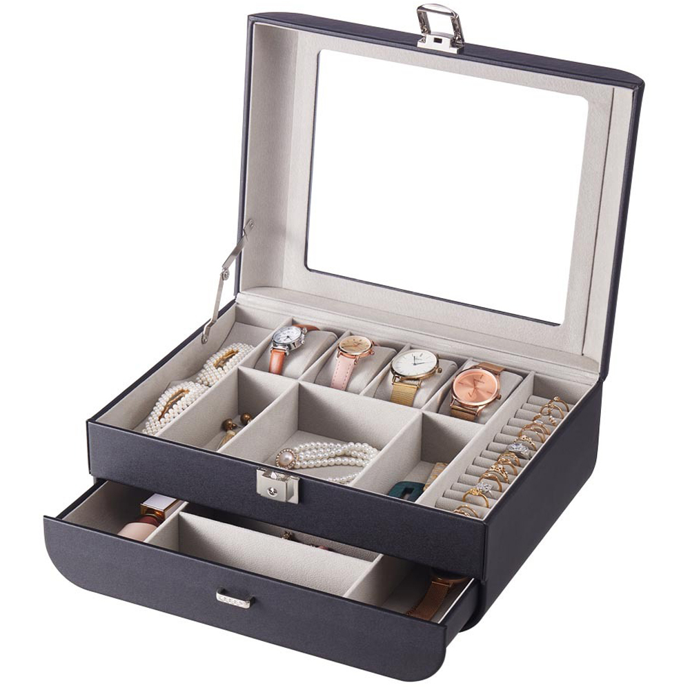 Crafted from leather inside and out, this jewellery box exudes sophistication and elegance. The transparent lid provides a clear view of your collection, making it easy to access and display your favourite pieces. With ample storage space, it features 4 watch slots, a row of ring slots, multiple compartments of varying sizes, and a bottom drawer with additional storage. Perfect for your dressing table or bedside table, this jewellery box adds a touch of style to any space.