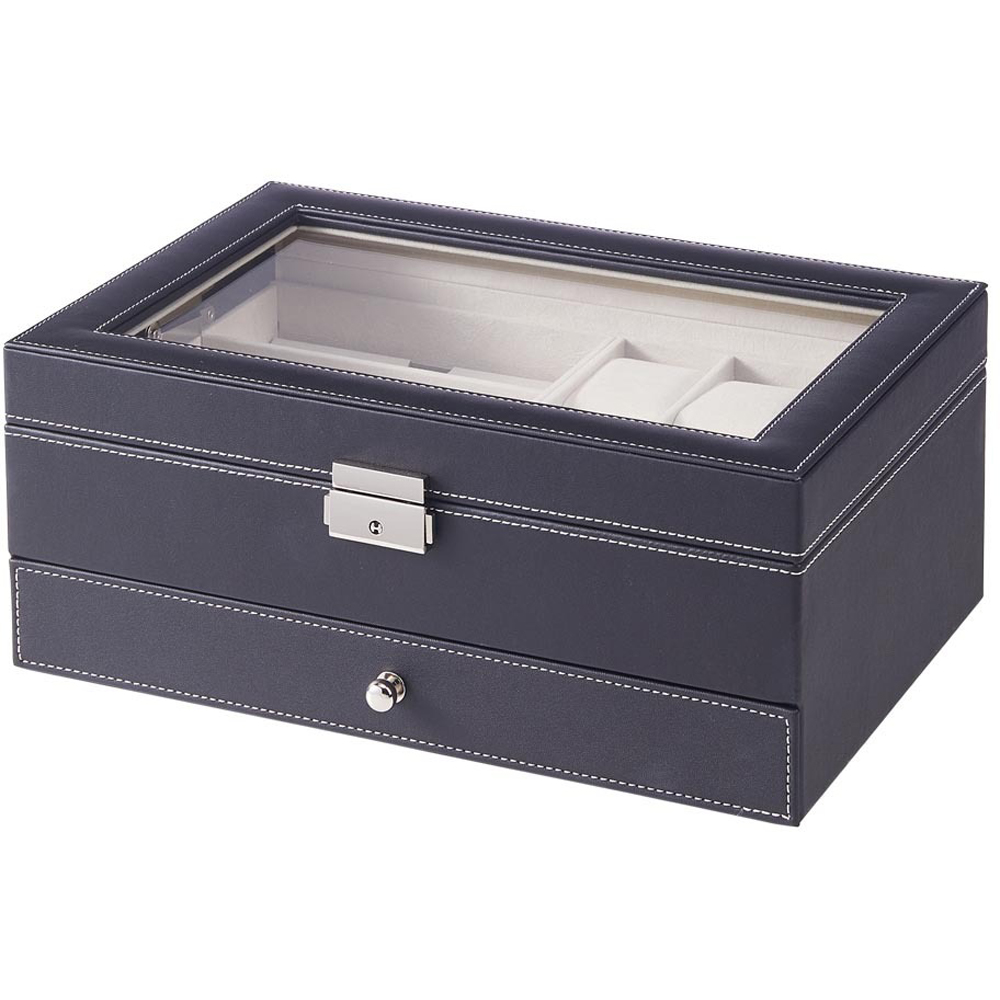 This jewellery box makes the perfect gift for jewellery enthusiasts. Its textured black leather exterior is waterproof and dustproof, complemented by a soft velvet lining that adds a touch of luxury. The 2-layer design includes 6 watch slots with thick foam padding to protect straps from deformation, along with multiple compartments and a drawer for bracelets, necklaces, and more. The transparent lid allows you to easily display and view your collection at a glance.