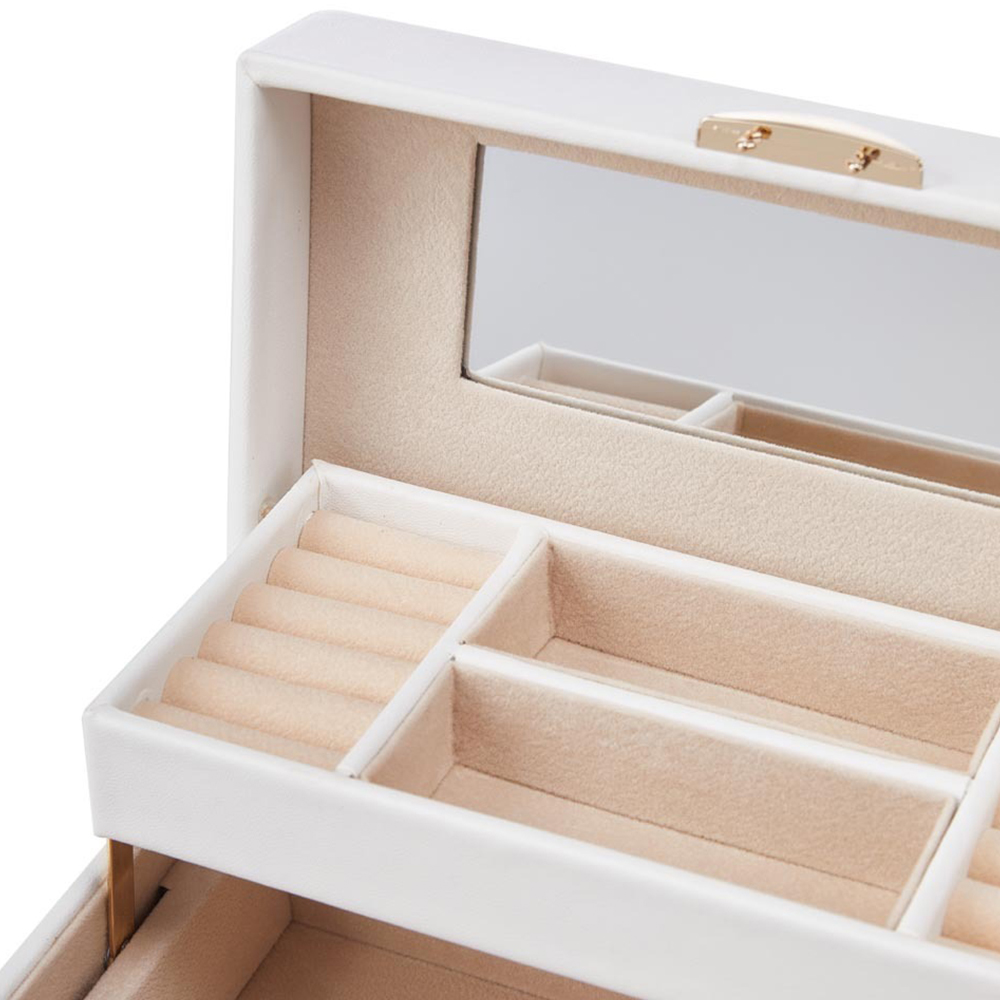 Start your day with elegance using this beautiful jewellery box, crafted with a clean white leather exterior. Inside, two layers of storage feature ring slots and compartments for earrings, while a hidden drawer is perfect for bracelets and bangles. Lined with plush velvet, it keeps your jewellery safe and preserves its shine. Plus, with a handy handle, it’s ideal for both home storage and travel.