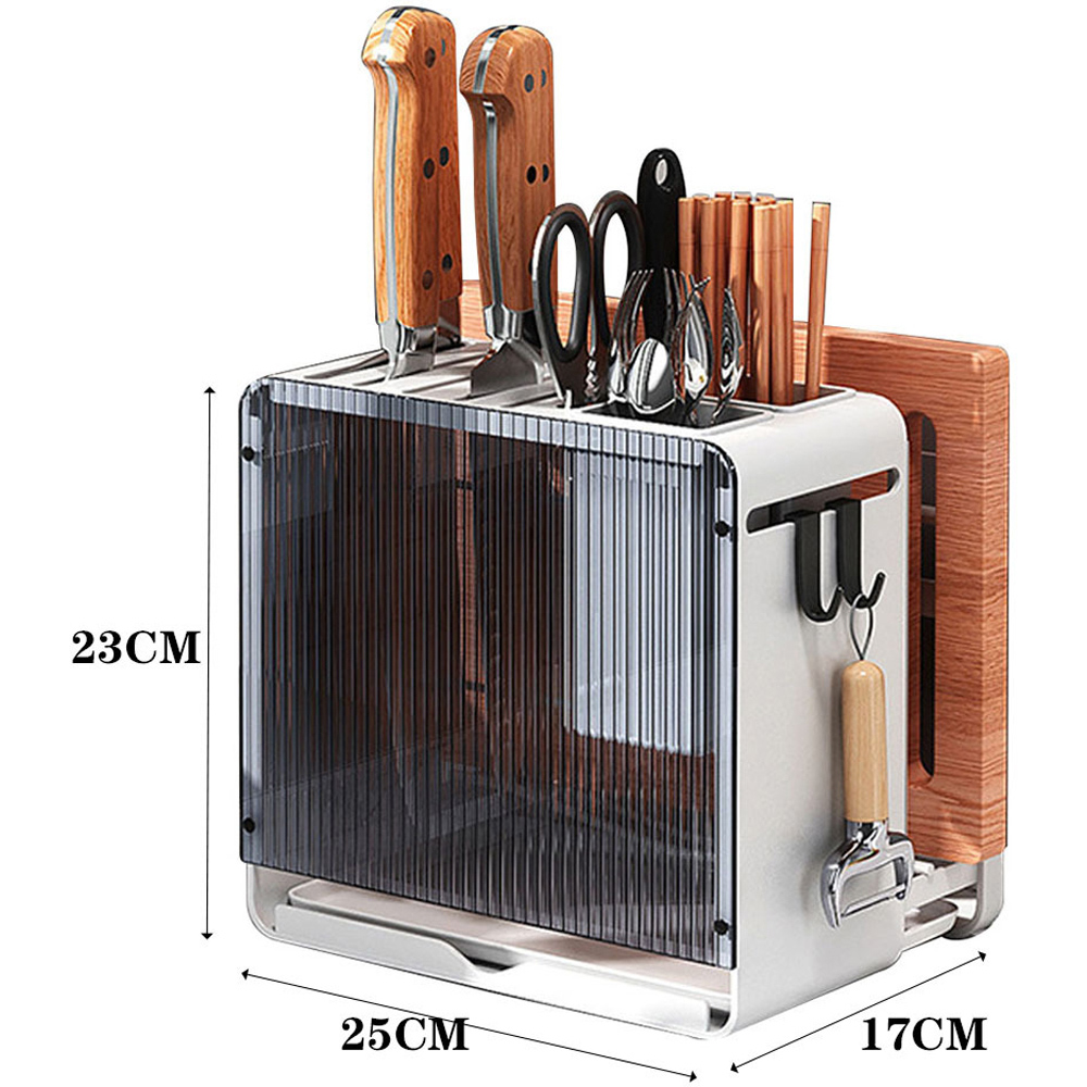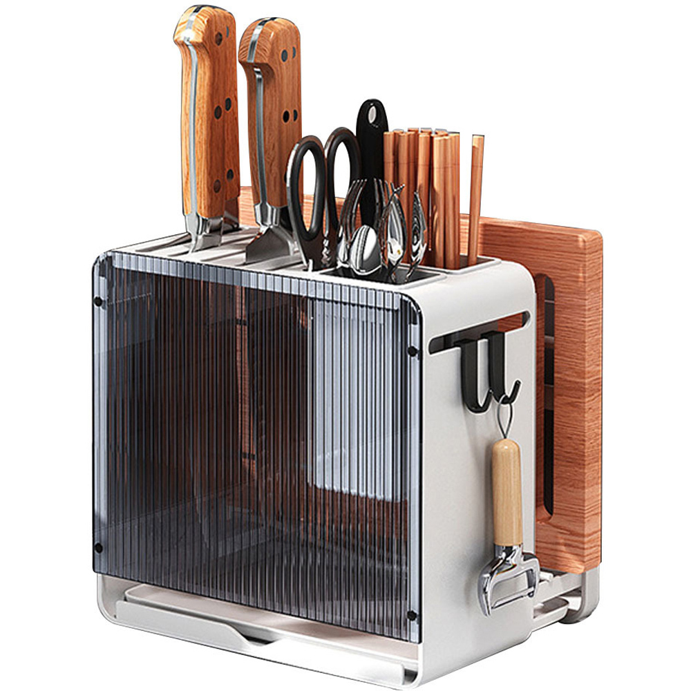 Unleash your culinary creativity with the Storage Rack, the perfect kitchen companion to keep everything in its place. With separate compartments for all your kitchen essentials, this rack ensures your countertop stays tidy and organised. It features a dedicated slot for cutting boards, six knife slots for your fruit knives and cleavers, and a drainage tray at the bottom to catch excess water—simply slide it out for an easy pour. This clever design helps you keep your kitchenware in check and your workspace clutter-free.