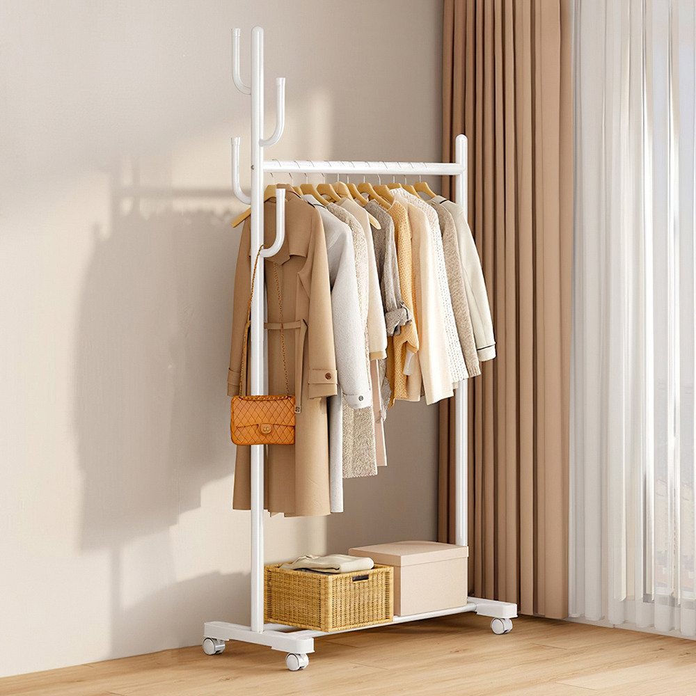 The Garment Rack combines durability and style to help you stay organised. Built from sturdy carbon steel, this rack can handle heavy loads with ease. Its elegant pearl-white finish adds a sharp touch to any room. The side tree hanger is perfect for accessories like bags, umbrellas, scarves, and hats, while the lower shelf provides extra storage for shoes, boxes, or baskets. With attached wheels, you can move it effortlessly around your home.