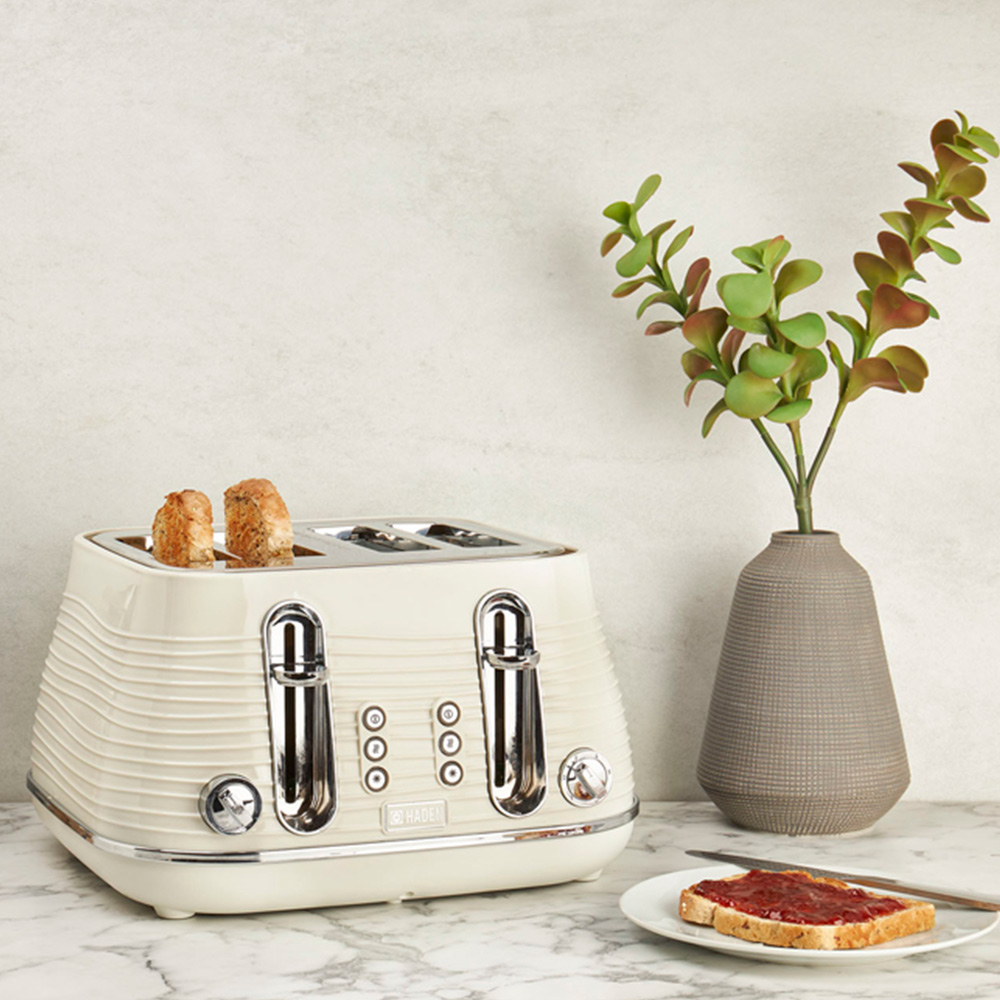 Inspired by the beautiful county of southwest England, known for its rolling hills, rugged coastlines, picturesque villages and landmarks, the Haden Devon toaster and design replicates the stunning sea hues and texture of the waves. Featuring the latest technology, this collection is developed and designed with convenience for every day. The Devon toaster has wider-than-average slots and six levels of browning control. It has a self-centring function that automatically centres bread for thorough results. The non-slip rubberised feet provide stability and enhanced safety when in use. The base includes handy cord storage to keep worktops tidy. The Devon breakfast set marks a new era for Haden, the go-to British breakfast brand.