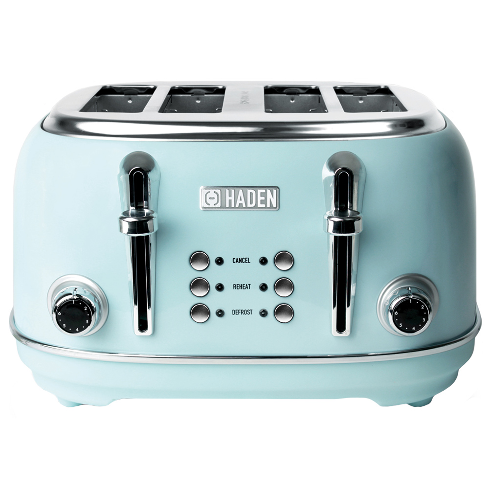 With a traditional design and shape, this beautiful turquoise four-slice toaster from Haden features convenient cancel/defrost/reheat settings, economy mode, a self-centring function and a removable crumb tray for easy cleaning. The self-centring function automatically centres bread for thorough results. Convenient dual control with adjustable browning controls and toasting timers. It is designed to keep your kitchen as tidy as possible with its removable crumb tray and the base of the toaster, including handy cord storage to keep your worktops tidy. It has extra wide slots to accommodate thick slices of bread.