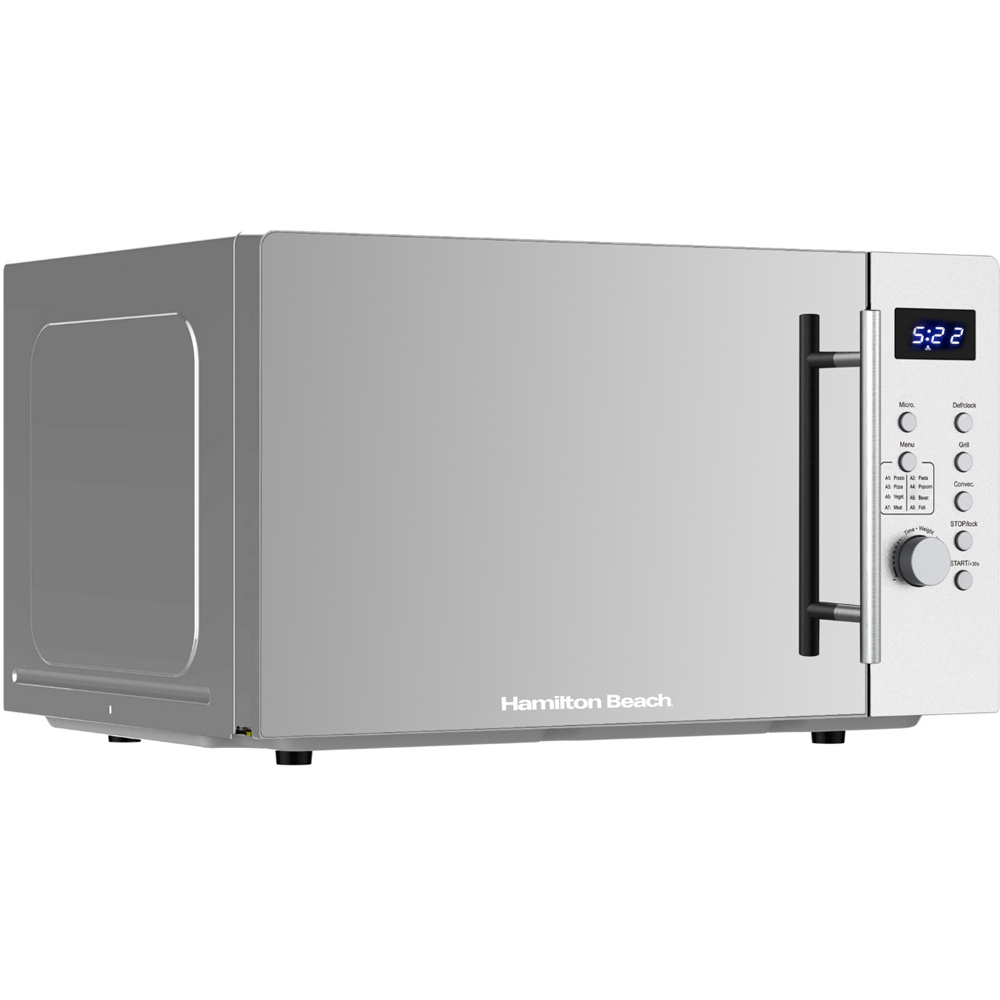 Make a practical addition to your kitchen with the Hamilton Beach Combination Microwave with Grill. This 30L microwave with grill is an ideal kitchen appliance with a mirrored door finish that will add a functional touch to your kitchen. It has a powerful 900W output with energy-efficient technology that makes it the perfect appliance for long-term use. This microwave features a combination aspect that enables you to combine microwave energy, a grill and fan-assisted convection heating so you can heat, roast, crisp and brown according to your preference. It is ideal for cooking lasagnas, pizzas, baked potatoes and cottage pies. This microwave has a 31.5cm wide removable glass turntable and a stainless-steel interior for easy cleaning. It also features weight and time defrost settings, a child safety lock and an easy-to-use control panel with a clock and digital timer. The choice of auto-cook menus makes programming your microwave simple and easy. It includes a grill rack and baking tray, ideal for preparing the meal of your choice according to your convenience.