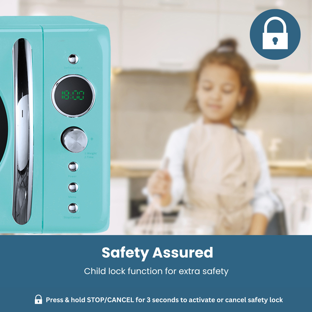 Make a classic and practical addition to your kitchen with the Hamilton Beach Mint Microwave. This compact 20L microwave is an ideal kitchen appliance designed to add a nostalgic touch to your kitchen. It has a powerful 700W output with energy-efficient technology that makes it perfect for anyone who values both performance and sustainability. This microwave features eight cooking presets that give you the flexibility to choose the ideal setting for your needs. This microwave offers precise control over your cooking process, whether you need to quickly heat up leftovers or defrost frozen dishes, this appliance has got you covered. The glass turntable provides even heating to ensure that your food is cooked to perfection. The easy-to-use manual control panel with a quick start function allows you to start cooking with just the touch of a button. The defrost function is perfect for thawing frozen food quickly and evenly while the digital LED display is easy to read and provides all the information you need immediately. This microwave also features a child lock function that prevents accidental use by little ones.