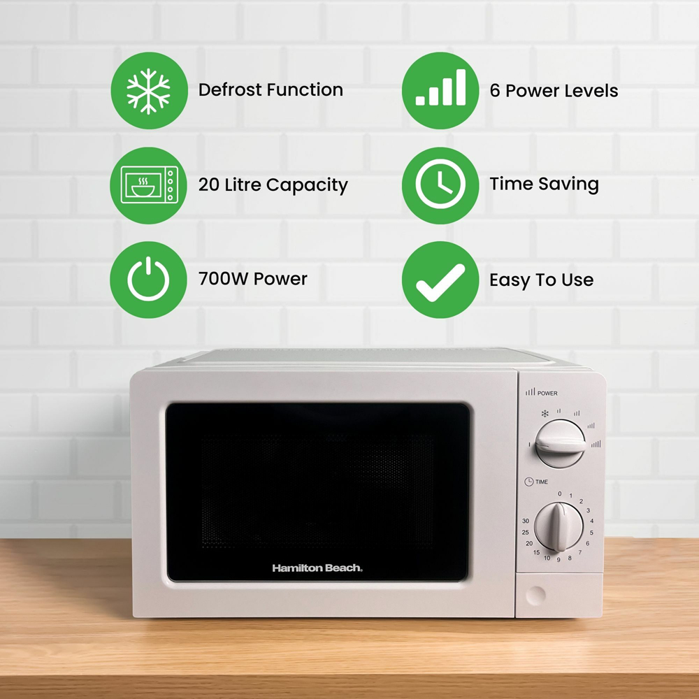 Make a reliable and functional addition to your kitchen with the Hamilton Beach White Microwave. This 20L microwave is an efficient kitchen appliance designed to save time and energy while delivering excellent results. It has a powerful 700W output with energy-efficient technology, a perfect choice for anyone who values both performance and sustainability. This microwave features six power levels that give you the flexibility to choose the ideal setting for your needs. The thirty-minute timer allows you to set your cooking time with precision while the manual dials let you adjust the power level to suit your recipe. The speed defrost function is perfect for thawing frozen food quickly and evenly while the cooking end signal lets you know when your food is ready. The energy-saving feature ensures that you save money on your utility bills, while the time-saving function makes meal preparation easy.