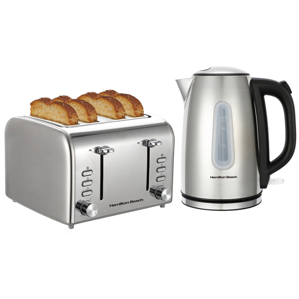 Kickstart your mornings with the Hamilton Beach HBKTPOLISH Polished Rise Kettle 1.7L and 4 Slice Toaster Bundle. This bundle includes a polished kettle and a rise four-slice toaster. The kettle provides a rapid boil with its 3kW element and is finished in a premium polished stainless-steel design. This coffee machine has a large 1.7L capacity and can make up to 12 cups of coffee in a single brew. The removable Nylon coffee filter is durable and washable, eliminating the need for paper filters. It also features a 360° rotational base, an ergonomic handle, perfect for right and left-handed use, and a 60-second anti-drip function, keeping your kitchen mess-free. There is a push button lid release for your convenience and a window to see how much water you're boiling. The toaster has a sleek stainless-steel design, which adds style and durability to your kitchen. You can customise your toast with variable browning for perfect crispiness. The removable crumb tray makes cleaning easy, while the 1600W power ensures quick and efficient toasting. You can enjoy total control with cancel, reheat, and defrost settings.
