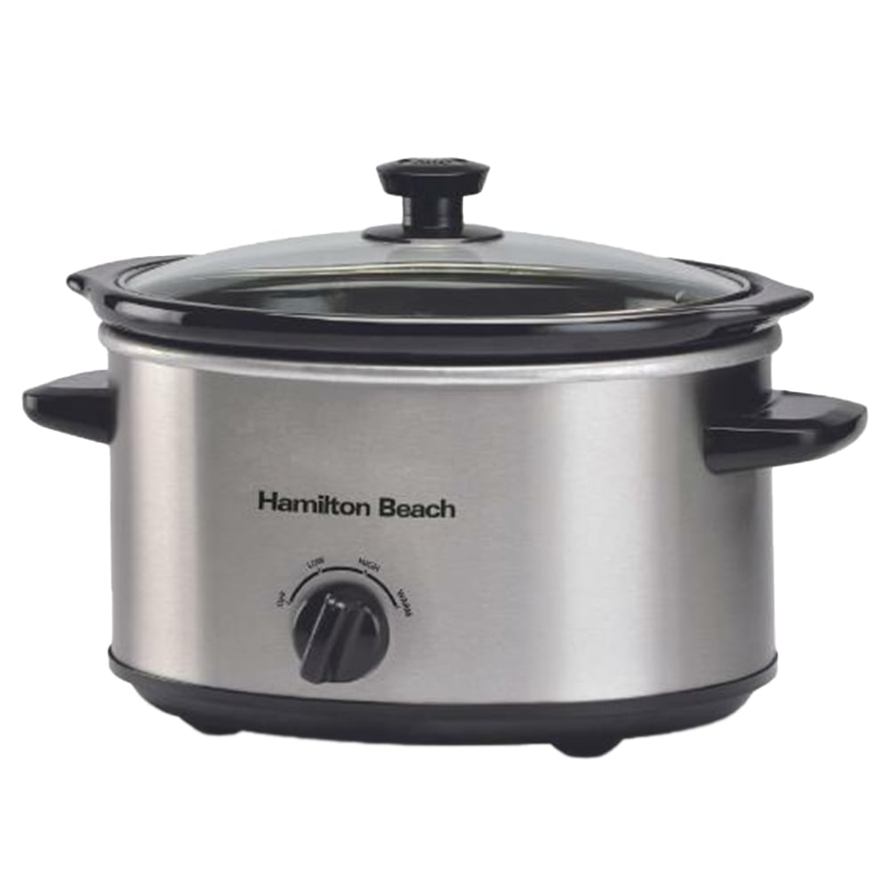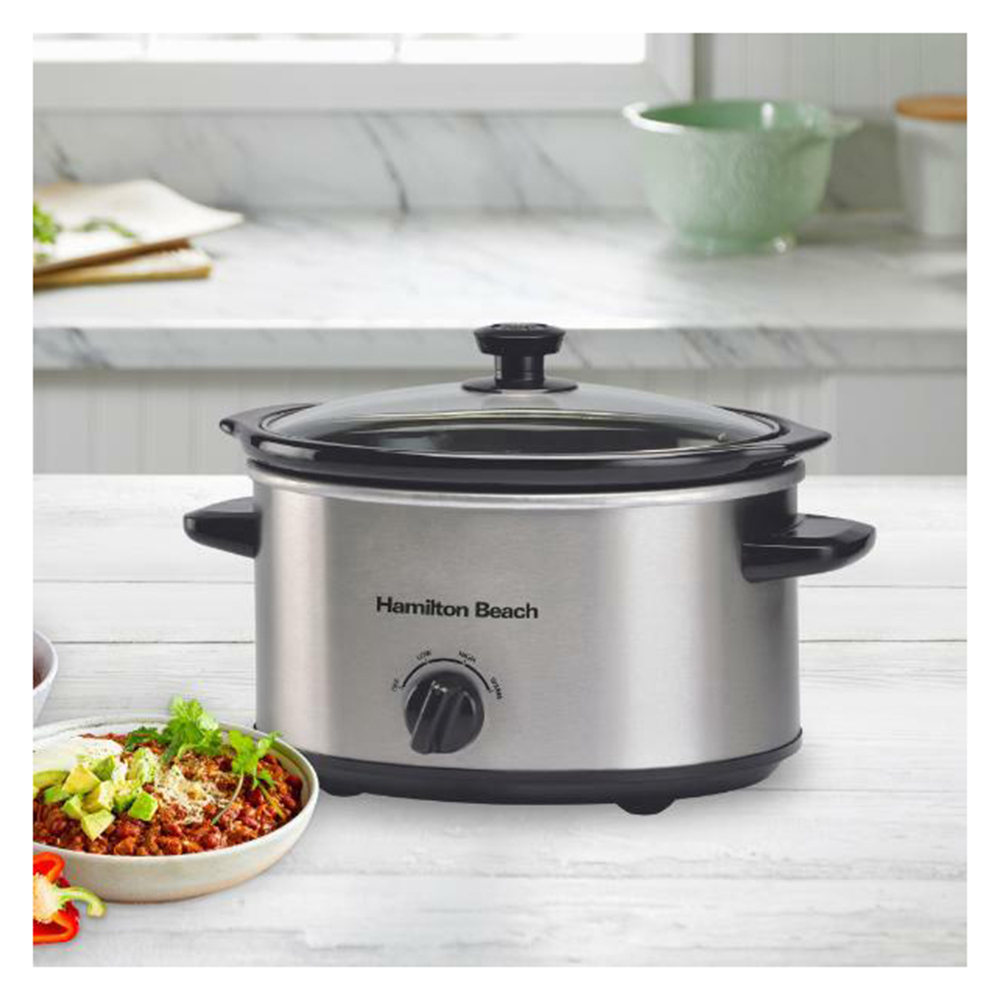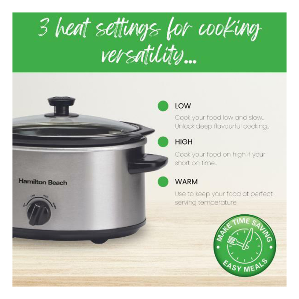 Cook delicious meals for your loved ones with this Silver Slow Cooker by Hamilton Beach. This 90W power cooker has a capacity of 3.5 litres, which is perfect for couples and individuals. It has a removable ceramic pot for easy cleaning. You can also clean it in a dishwasher. With the oven-safe ceramic pot, it finishes meals with perfect results. The tempered glass lid allows you to monitor food without heat loss, complimented by cool touch handles for easy transport. The cooker features manual temperature control with low, high, and warm settings. With all the qualities this energy-saving cooker offers, it becomes a time-saving solution for busy families who want homemade meals without the hassle.