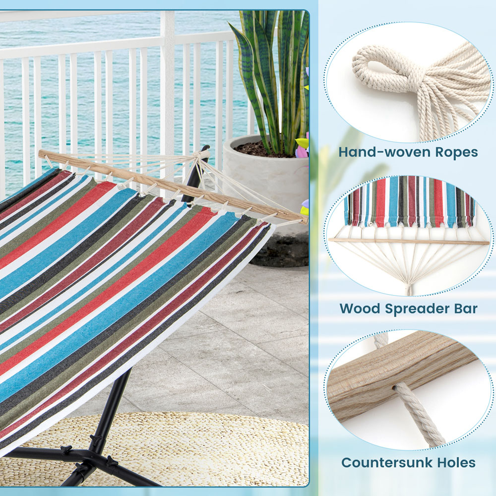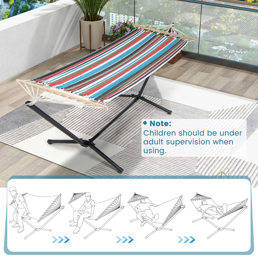Create your perfect outdoor oasis with the Costway Multicolour Hammock, which comes with a 3.2m heavy-duty stand made from rustproof metal, ensuring durability and stability with a weight capacity of up to 150 kg. The hammock features skin-friendly and breathable poly-cotton fabric for ultimate comfort, whether you're lounging with a book, soaking up the sun, or taking an afternoon nap. The included carrying bag makes transportation easy, allowing you to take your hammock from the garden to the beach or on camping trips, ensuring it stays in pristine condition. Simple to set up with a detailed user manual, this portable hammock is perfect for transforming your patio, garden, or backyard into a leisure space for complete relaxation. Note: Children should be supervised by adults when using.