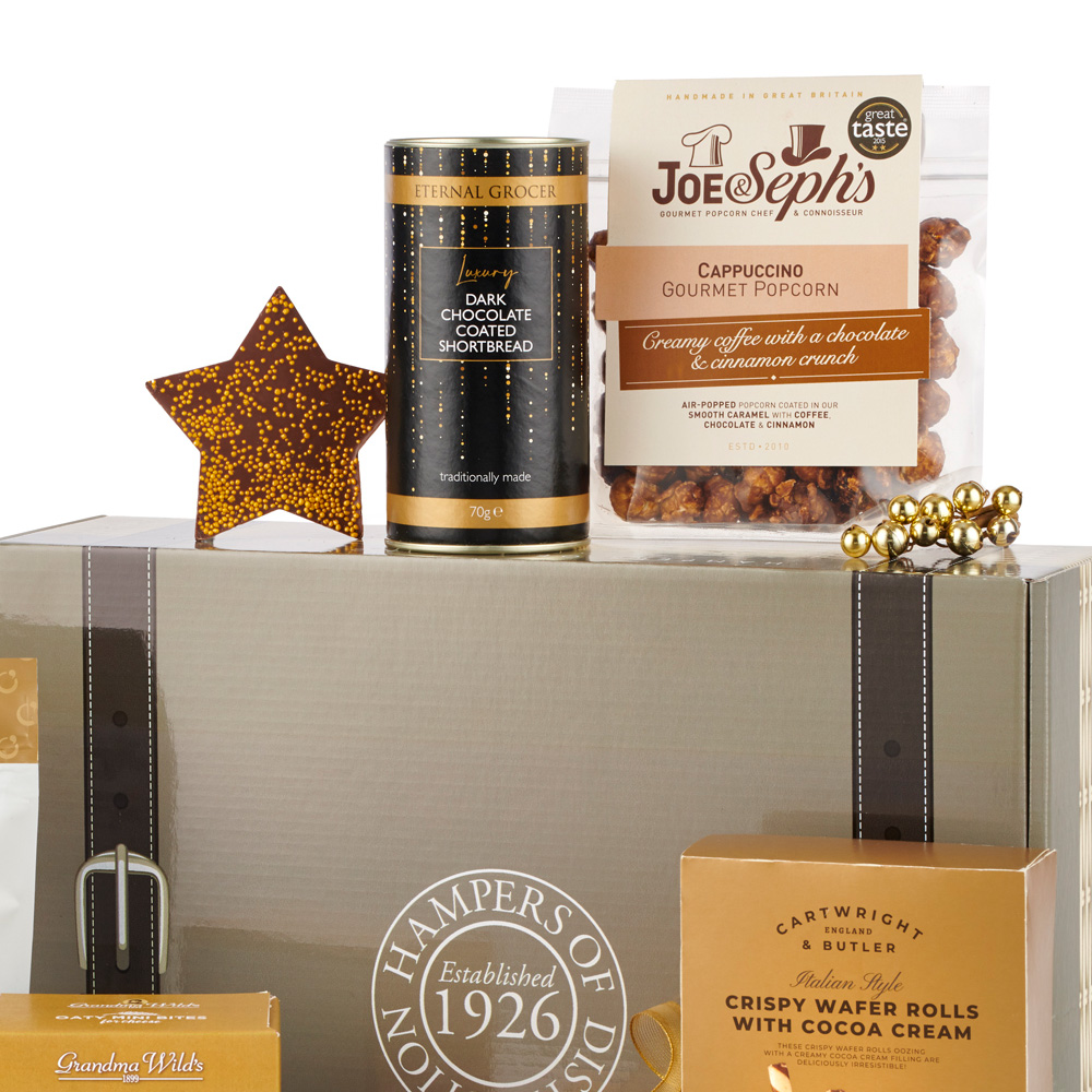 Celebrate the season with timeless treats in Hampers of Distinction Alcohol-Free The Delicious Treats Hamper. This festive hamper is packed with beloved holiday favourites, including indulgent chocolate truffles and creamy, melt-in-your-mouth fudge. Perfect for gifting or enjoying with loved ones, it’s a charming way to spread holiday cheer and make every moment a little sweeter. The hamper includes Buttermilk Clotted Cream Fudge 50g, Jacquot Classic Truffles 200g, Grandma Wilds Mini Bites Mature Cheddar 100g, Eternal Grocer Tube Choc Coated Shortbread 70g, Reid's Spiced Fruit Shortbread 150g, Thornton and France Milk Chocolate Star 40g, Cartwright and Butler Chocolate Wafer Rolls with Cocoa Cream 150g, Joe and Seph's Cappuccino Popcorn 32g, Taste Savoury Cranberry and Pumpkin Seed Biscuits 50g, Lily O'Brien's Creamy Caramel and Sea Salt 100g, packed in wicker look gift box. For additional information on allergies, ingredients and nutrition click here.