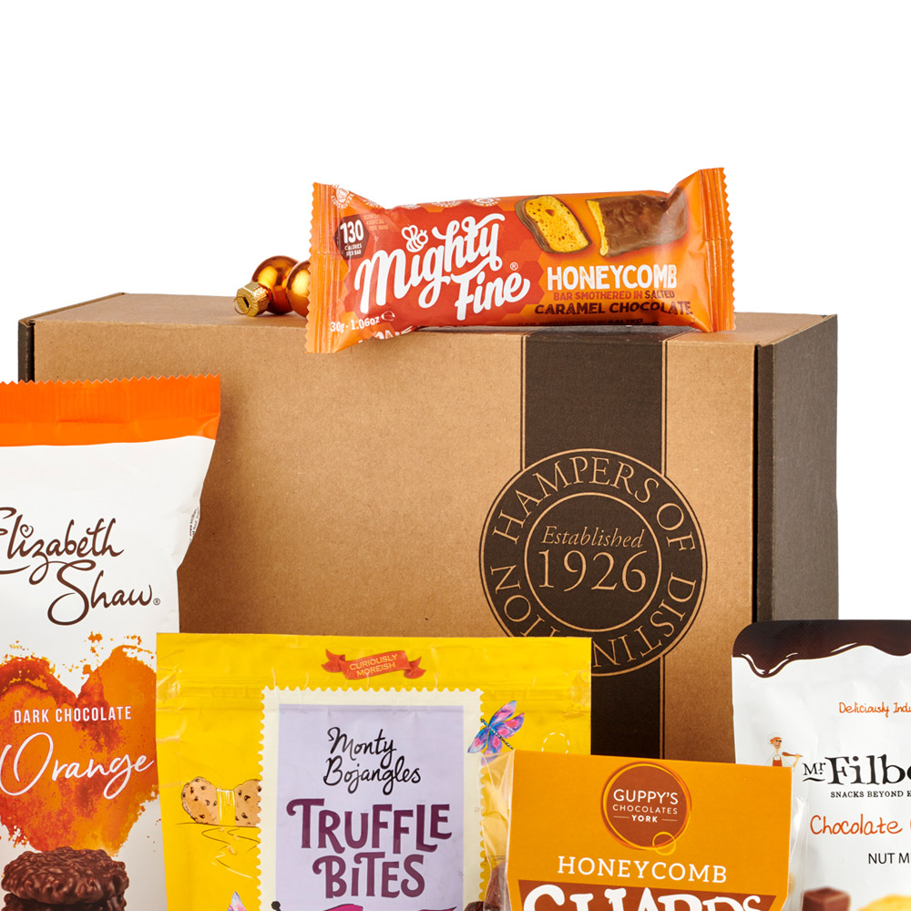 Satisfy your sweet cravings with Hampers of Distinction The Chocolicious Hamper. This one-of-a-kind hamper captures the essence of sophisticated adult treats and features a selection of luxury chocolates, perfect for those with a refined palate. Immerse yourself in the sweet, nuanced flavours, exquisite textures, and captivating aromas of these treats. Whether you're treating someone else or indulging on your own, each bite promises a decadent journey into the world of pure chocolate bliss. This hamper includes Filbert's Chocolate Orange Nut Mix 75g, Guppy's Honeycomb Shards 45g, Mighty Fine Salted Caramel Chocolate Honeycomb Bar 30g, Monty Bojangles Caramel and Cookie Truffle Bites 100g, Ultimate English Chocolate Brownie Fudge 150g, Elizabeth Shaw Dark Chocolate Orange Biscuits 140g, packed in kraft gift box. For additional information on allergies, ingredients and nutrition click here.