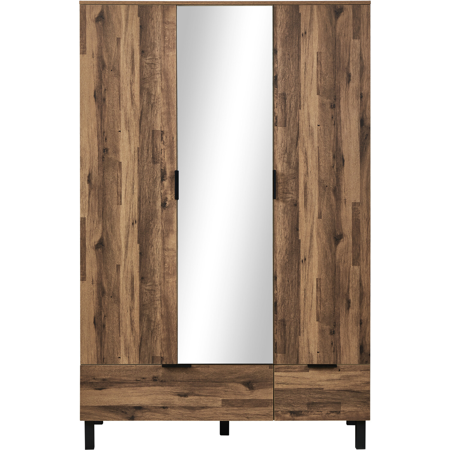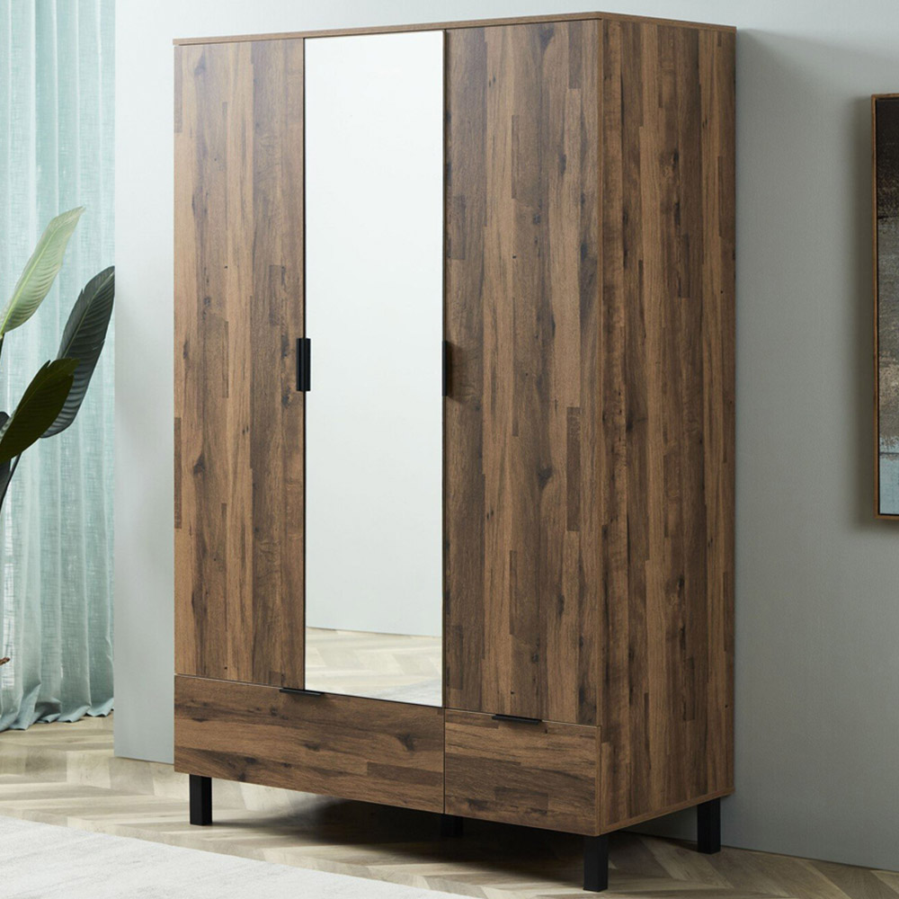 This Hampshire Triple Wardrobe with Mirror offers a perfect match for your bedroom with a modern oak finish and contrasting black metal legs and handles. It's easy to assemble and clean for your convenience and features plenty of storage space thanks to the clothes rail and included shelving, which can be used for bedding, shoes, bags, and more. The mirror on the front of the wardrobe allows you to check your outfit as you get dressed too, and helps to save wall space if you don't have the space to hang a separate mirror.