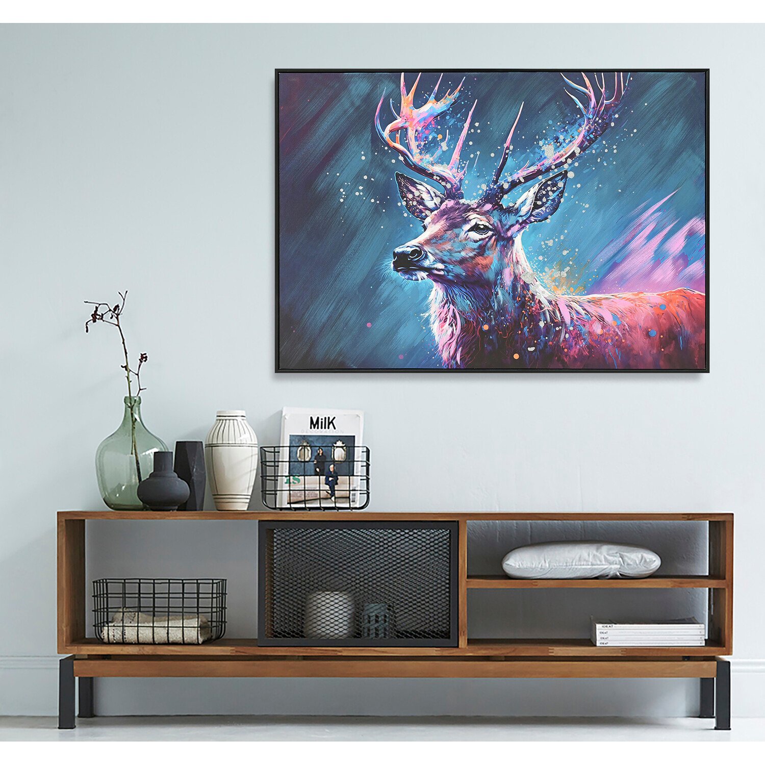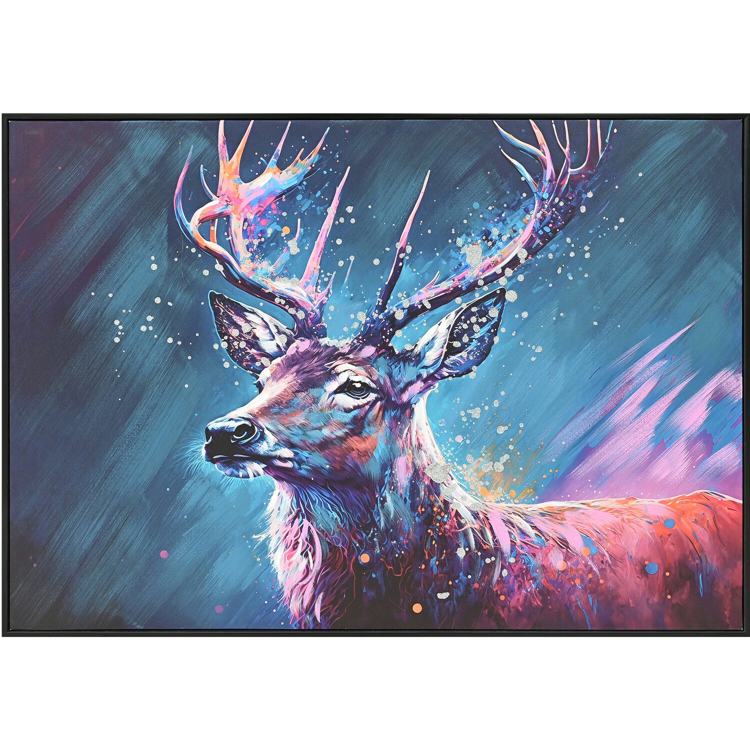 The Hand Painted Midnight Stag Framed Canvas is a beautiful centrepiece for any room. The canvas depicts a regal stag in stunning, contrasting blue, pink, and white colours to create a dramatic and contemporary finish. The canvas is finished with a coordinating frame and is quick and easy to hang in any living space via the metal clip on the back.