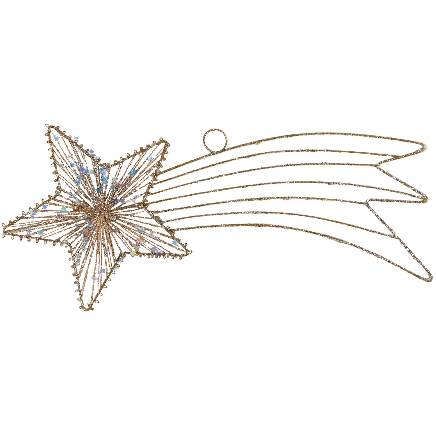This beautiful Hanging Shooting Star Decoration is a great way to decorate your space for Christmas. Shaped to look like a shooting star and finished with golden glitter and iridescent stars, it will hang elegantly from any wall, ceiling, or window. Thanks to the traditional golden tones, it's easy to coordinate with your festive decorations and is sure to add some fun to your Christmas decor.