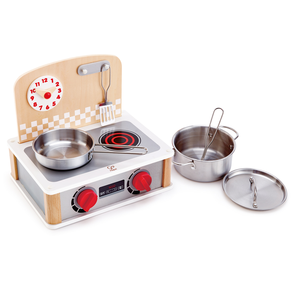 Foster your little one's culinary skills with the Hape 2-in-1 Kitchen and Grill Set. This set features metal utensils, interactive knobs that click and turn, and an adjustable clock. Encourage your child to lift the lid of the realistic metal pot to enjoy the aroma of the food and modify the heat using the knobs on the hob. The clock board can be removed, and the hotplate board can be flipped over to unveil a grill, creating an outdoor barbecue experience.