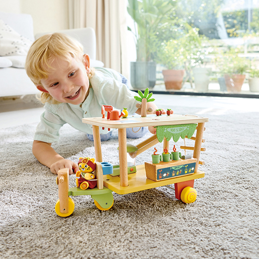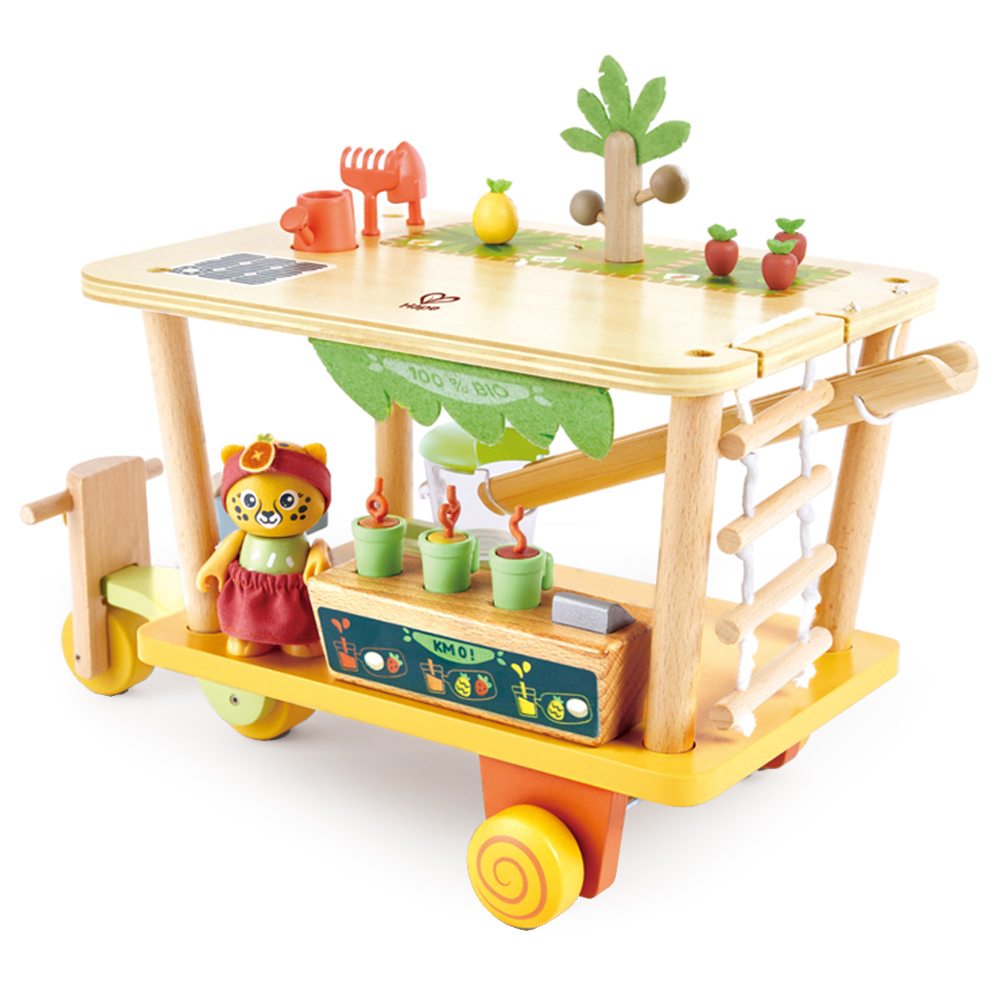 Encourage imaginative play with the Hape Bio Juice Shop. Join Clio as she zooms around town serving fresh, local smoothies and promoting the benefits of carbon-neutral fruit. This playset allows children to engage in plant care, and juice crafting, and learn about the essence of carbon-neutral living. Start the fun by making Clio climb the ladder to the rooftop garden, picking the ripest fruits, and watching them zoom down an exciting slide straight into the mixer. Once the juices are ready, detach the motorbike from the juice shop for swift deliveries. Through play, children can also learn about renewable energy by using the solar-powered juice shop motorbike, fostering environmental awareness. Plus, this set encourages healthy habits by emphasising the benefits of fresh fruit juices and the importance of caring for nature. It also promotes the benefits of growing and eating your own fruit and vegetables.