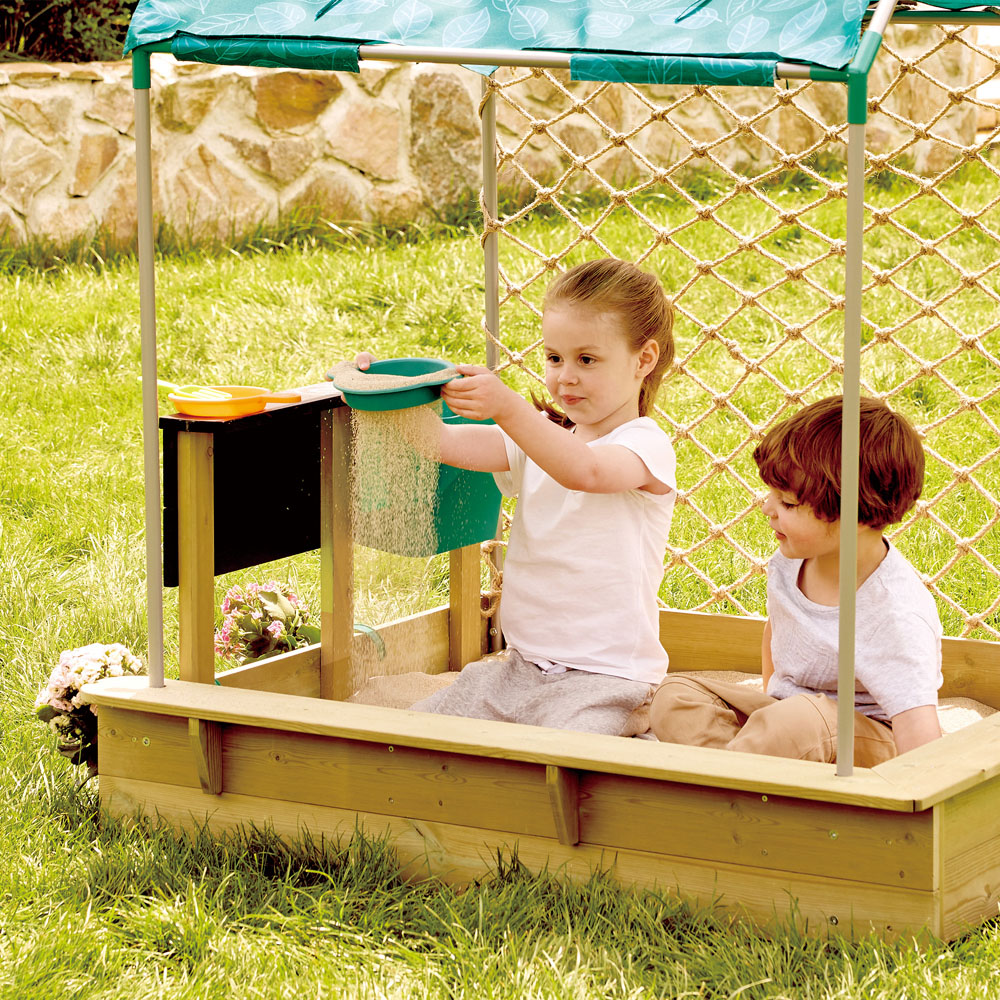 - Features a sandpit, kitchen, bin, easel and a roof