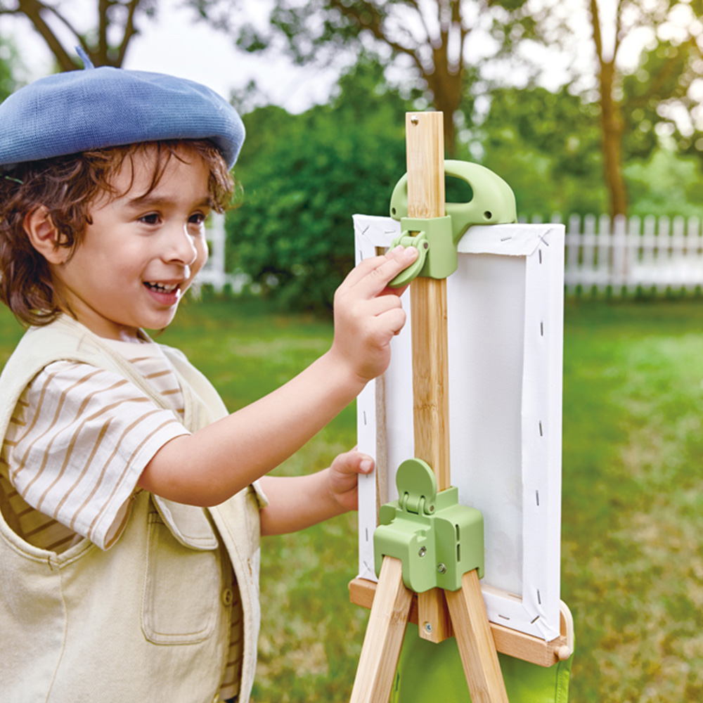 Bring out creativity with the Hape Portable Bamboo Easel Play Set. This portable easel comes with an easy-to-assemble bamboo body, three easel leg connectors, one canvas, one wooden drawing board, one foldable brush case, one cup, two clips, and an adjustable tray with a handle. This set ensures an all-encompassing artistic experience. It is crafted from sustainable bamboo and adds a touch of environmental friendliness to the creative process. You can position the easel to cast shadows, inspiring children to trace and use them as the foundation for unique art pieces. This feature adds an extra layer of creativity to outdoor art sessions. You can effortlessly adjust the easel's height with a simple pull, catering to your child's unique needs with tall, medium, and short options. This adaptability ensures a comfortable and personalised drawing experience. This easel is designed for easy self-assembly with only eight bamboo pieces. It has lightweight and detachable accessories that make it backpack-friendly for outdoor adventures encouraging independence and exploration. Suitable for children aged four years and above.