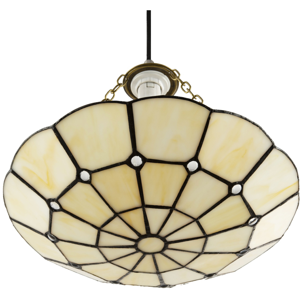 Beautifully 100% handmade Tiffany glass easy fit pendant lamp shade with antique brass chain. Simply attaches to your existing ceiling pendant cable. Features light amber stained glass panels and decorative clear small beads, which look stunning when light shines through. Total product measurements: H6 x Dia30cm. The total height once installed, including the chains, is 19cm. Please note that the ceiling rose and cable are not included - pendant shade only being sold. Features shade reducer ring allowing both 60mm and 42mm (ES, SES, BC). Requires 1 x maximum 40W bulb (not included). LED and low-energy bulbs may be used if desired. Light bulb not included. Be aware that oil is used in the manufacturing process. Upon first use, please wipe off any excess oil with a dry cloth.