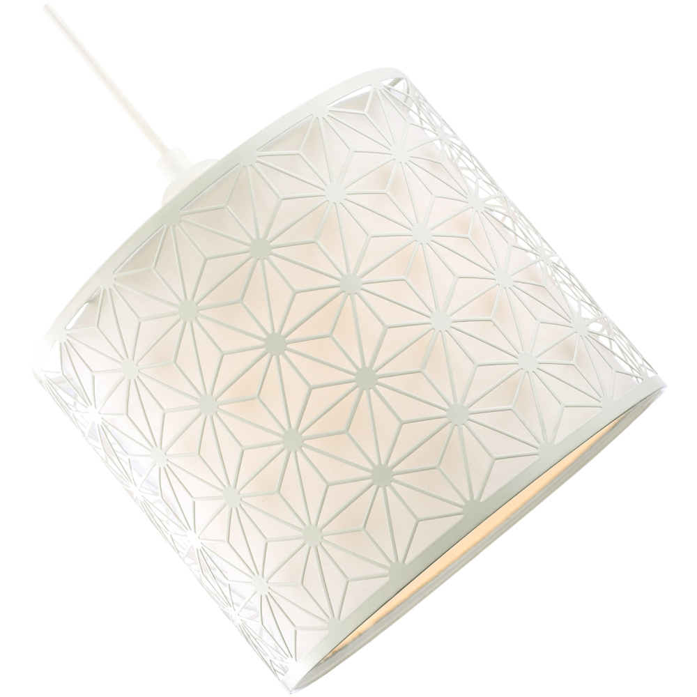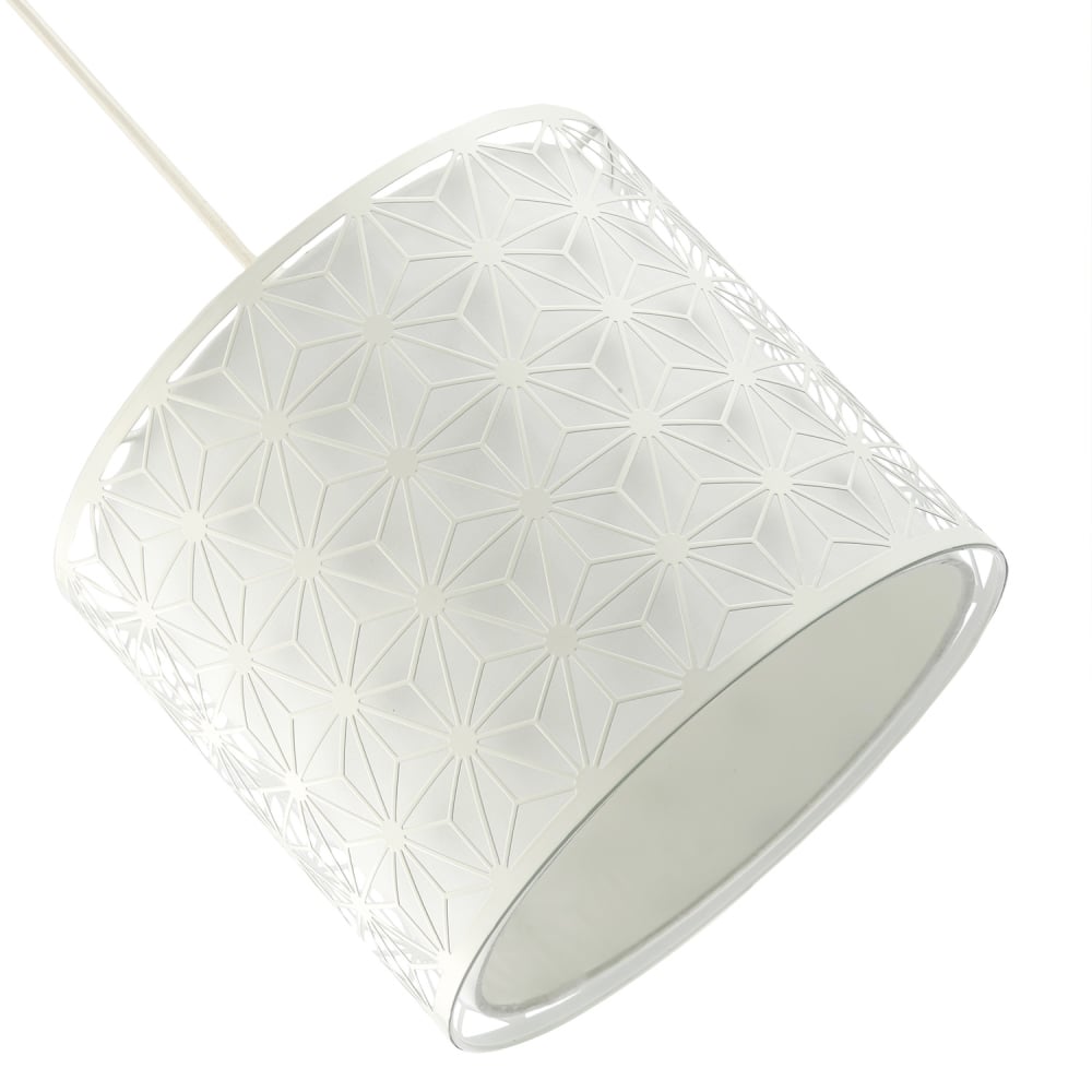 Unique and modern double pendant drum light shade which simply attaches to your existing pendant cable. The outer shade is white gloss metal with unique geometric design which creates a stunning effect when light shines through and the inner is a white cotton shade which subtly diffuses the light. The product dimensions are as follows: Height - 21cm, Depth - 25cm, Width - 25cm. Maximum wattage allowed is 60W. Please note that ceiling rose and cable is not included - pendant shade only being sold. Complete with shade reducer ring allowing for most lamp bases - B22/BC, E14/SES and E27/ES. Light bulb not included.