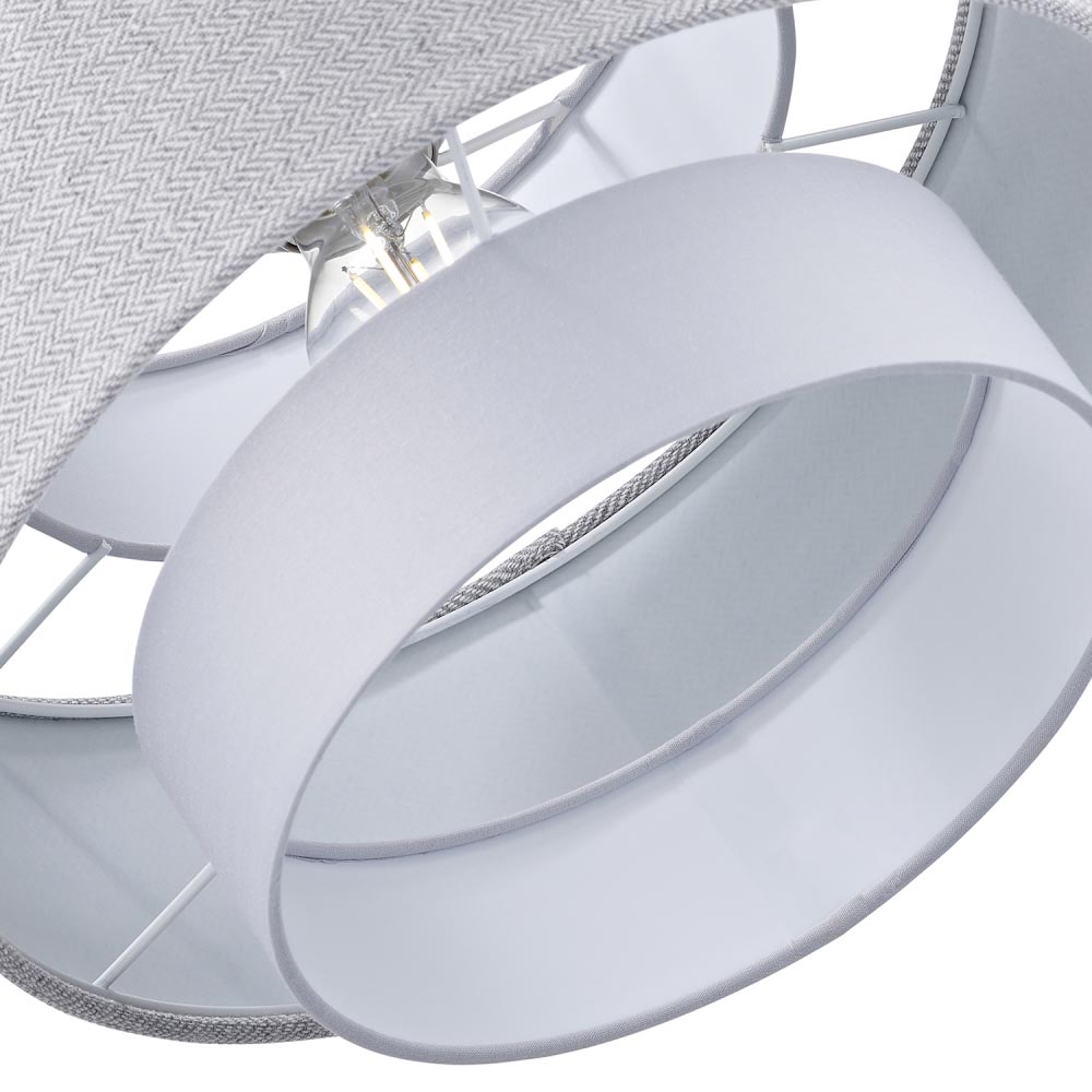 Contemporary and unique non-electrical pendant lamp shade with a unique triple-tier design. Simply attaches to your existing pendant rose. Features eye-catching middle ring of grey herringbone linen fabric with upper and lower matching grey cotton fabric rings. Dimensions: H20 x W30 x D30cm. The maximum wattage allowed is 60W. Please note that the ceiling rose and cable are not included - the pendant shade only is being sold. Complete with shade reducer ring allowing for all lamp bases - B22/BC, E14/SES and E27/ES. Light bulb not included.
