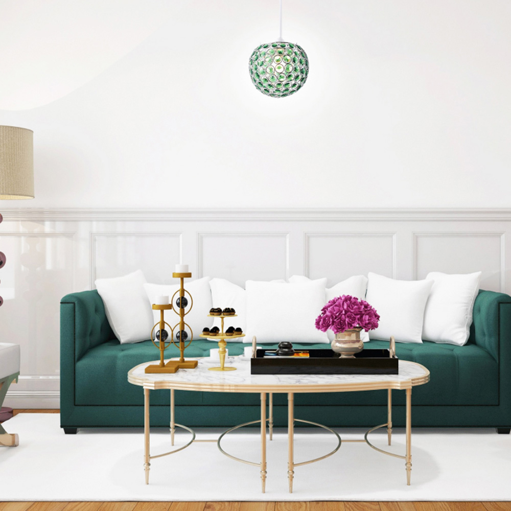 Contemporary and unique easy fit pendant light shade with polished chrome plated metal spherical frame. Includes multiple small circular decorative forest green acrylic beads which give off an eye-catching crystal glass effect. Total product dimension: Height - 18cm, Width - 18cm, Depth: 18cm. Maximum wattage allowed is 60W. Please note that ceiling rose and cable is not included - pendant shade only. Complete with shade reducer ring allowing for most lamp bases - B22/BC, E14/SES and E27/ES. Light bulb not included.